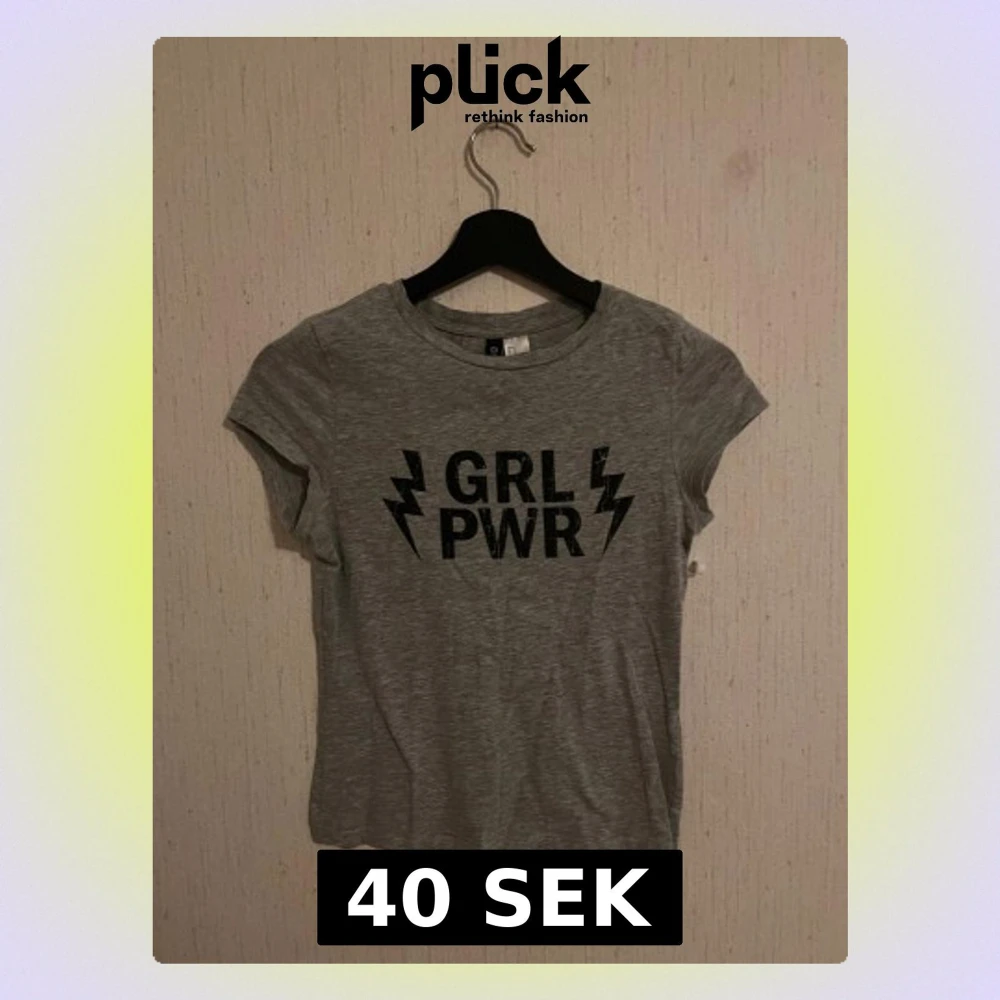Snygg grå t-shirt från H&M med svart GRL PWR-tryck och blixtar på bröstet. T-shirten har rund hals och korta ärmar, perfekt för dig som gillar statement-plagg. Materialet är mjuk bomull som känns skönt mot huden.