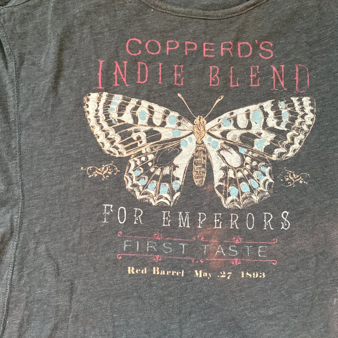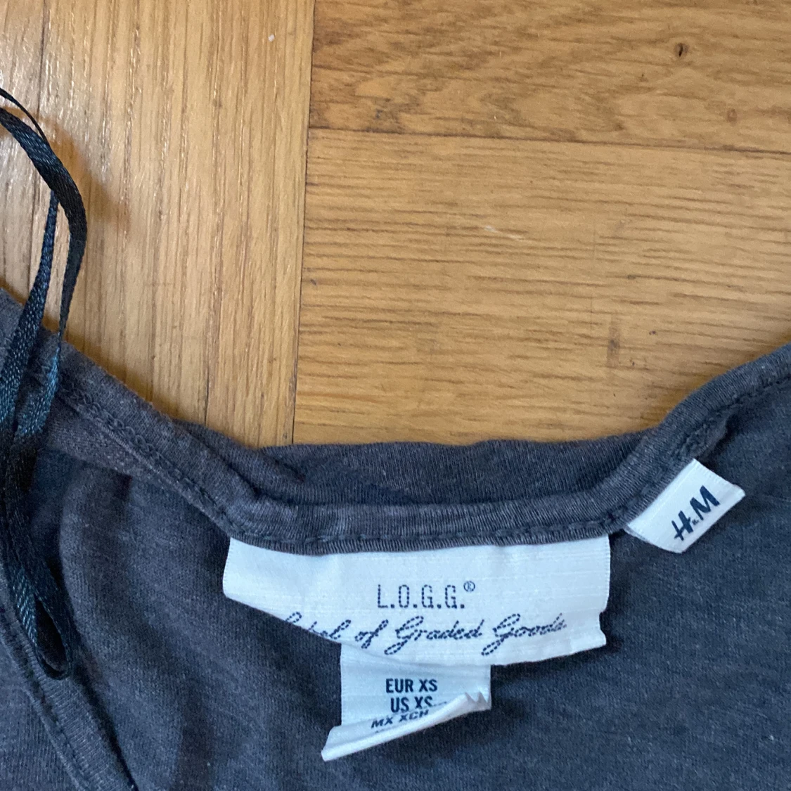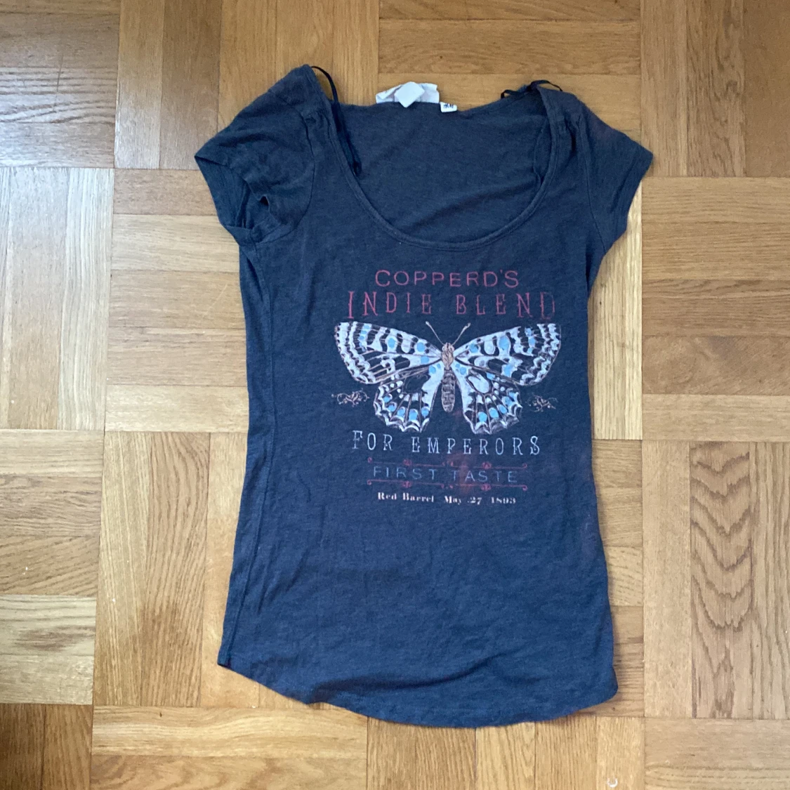 T-shirt i lång modell med tryck. Väldigt skön. Storlek: XS Köpt på HM ca 2010