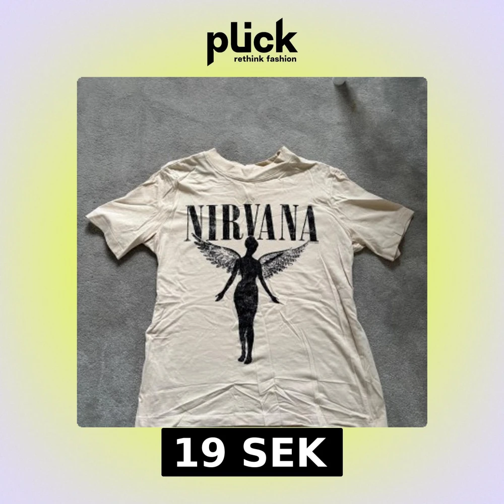 Säljer en beige t-shirt från H&M med ett stort svart Nirvana-tryck på framsidan. T-shirten har korta ärmar och är tillverkad i bomull.