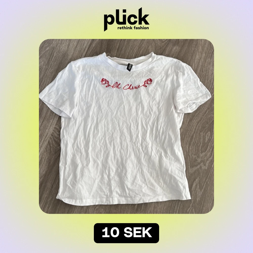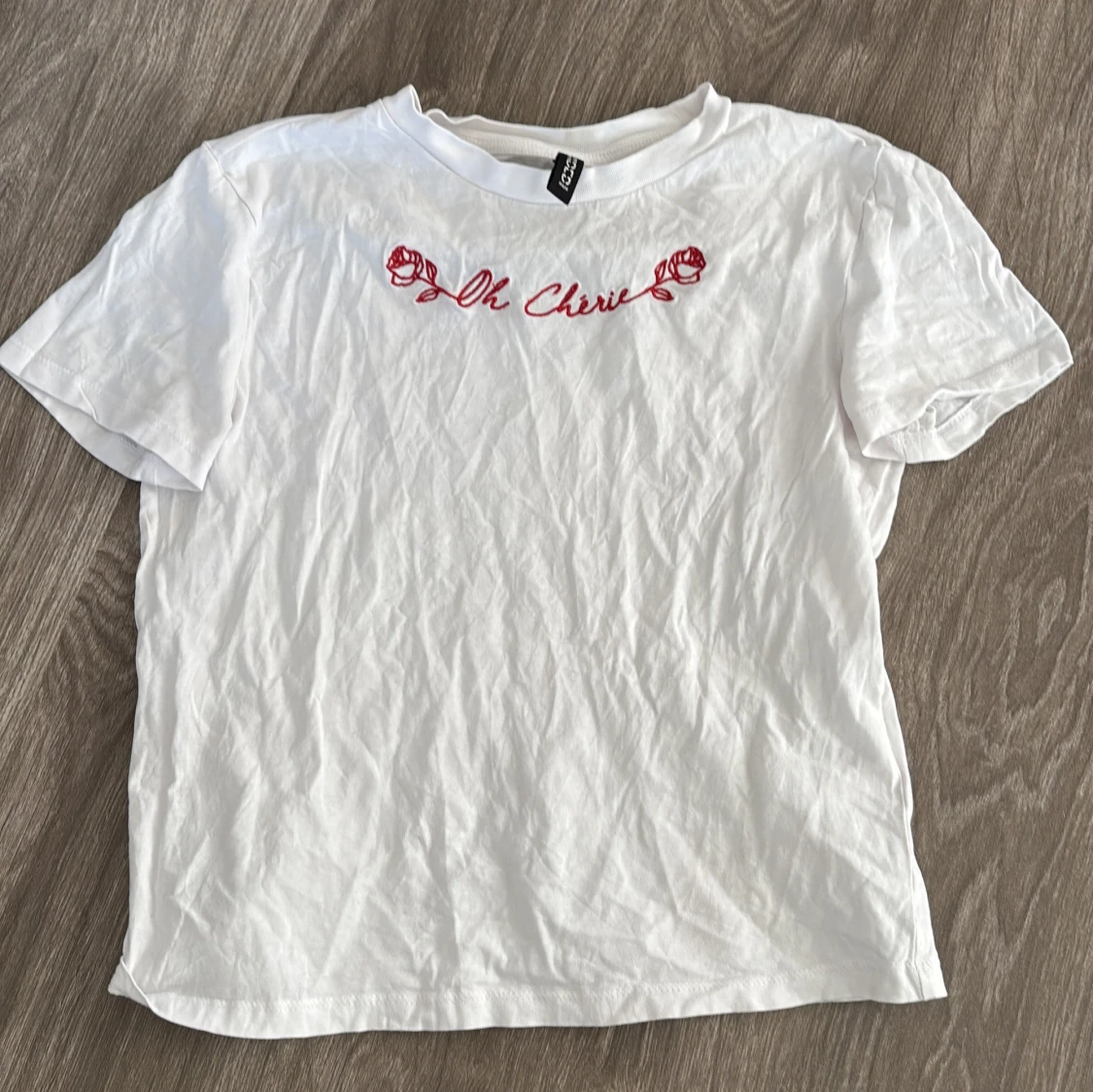 Säljer en vit t-shirt från H&M med röd broderad text 'Oh Cherie' och rosor på bröstet. Den är kortärmad och i bomull.