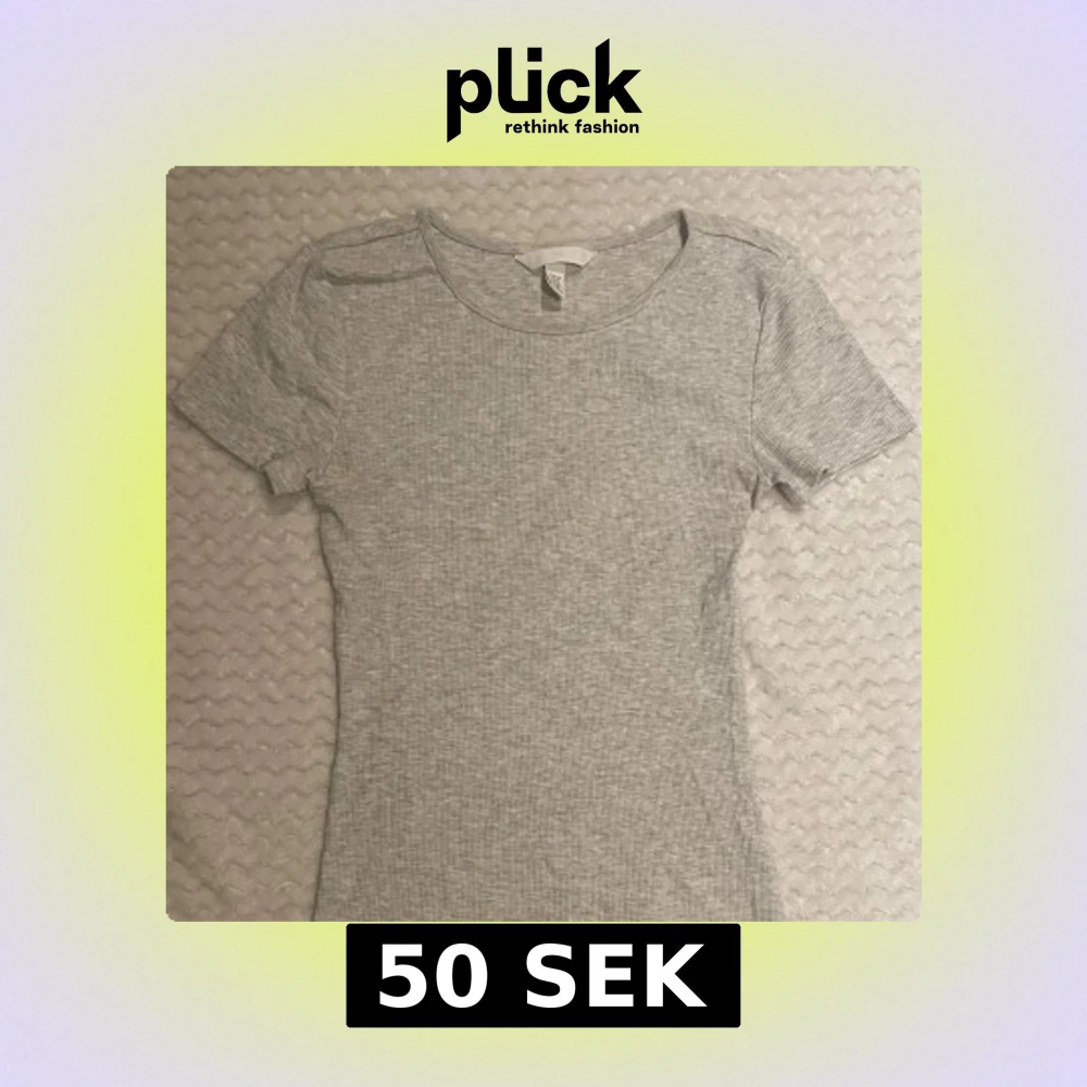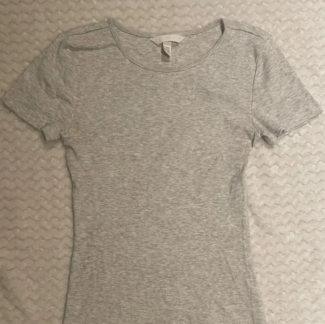 En enkel och stilren ljusgrå ribbad t-shirt från H&M. T-shirten har korta ärmar, rund halsringning och är gjord i mjuk bomull. Perfekt att matcha med jeans eller kjol för en avslappnad look.