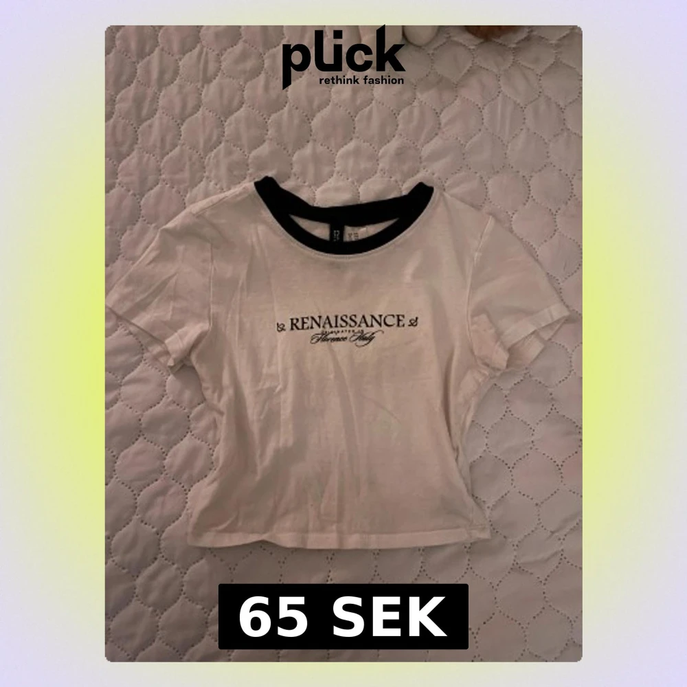 Säljer en vit croppad t-shirt från H&M med svart kontrastkrage och trycket 'RENAISSANCE originated in Florence Italy' på bröstet. T-shirten har korta ärmar och är gjord i mjuk bomull. Perfekt för dig som gillar clean stil med en twist.