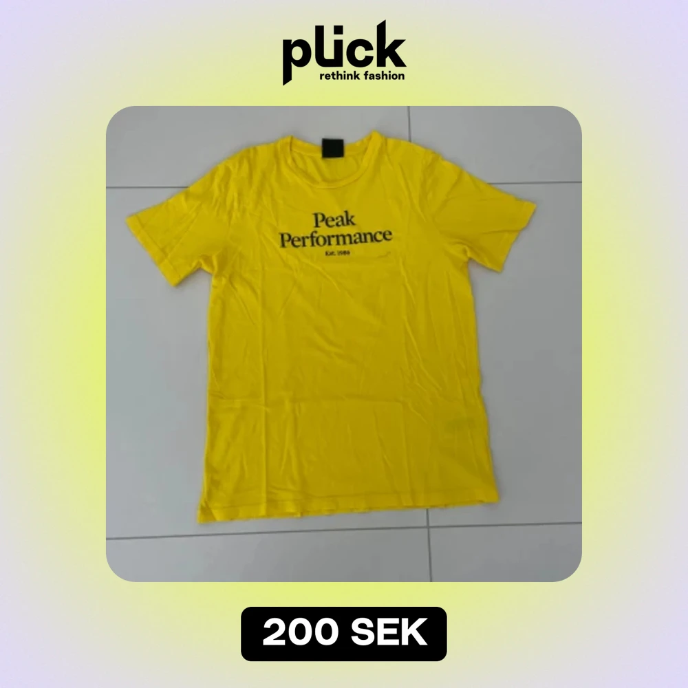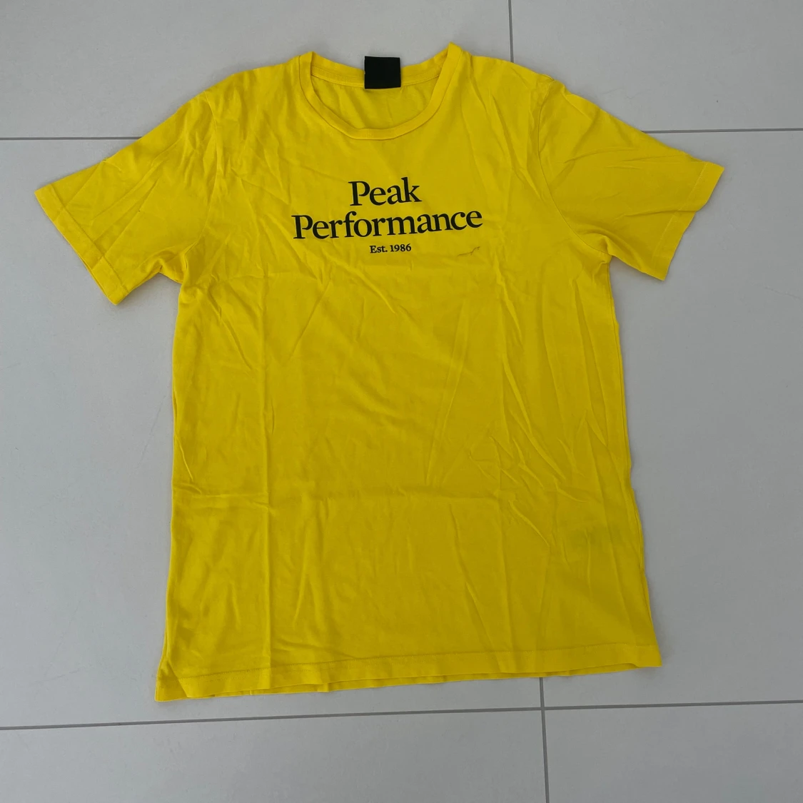 Säljer en snygg gul t-shirt från Peak Performance. Den har en klassisk passform med korta ärmar och ett tryck på framsidan. Perfekt för sommardagar eller som ett färgglatt inslag i garderoben!