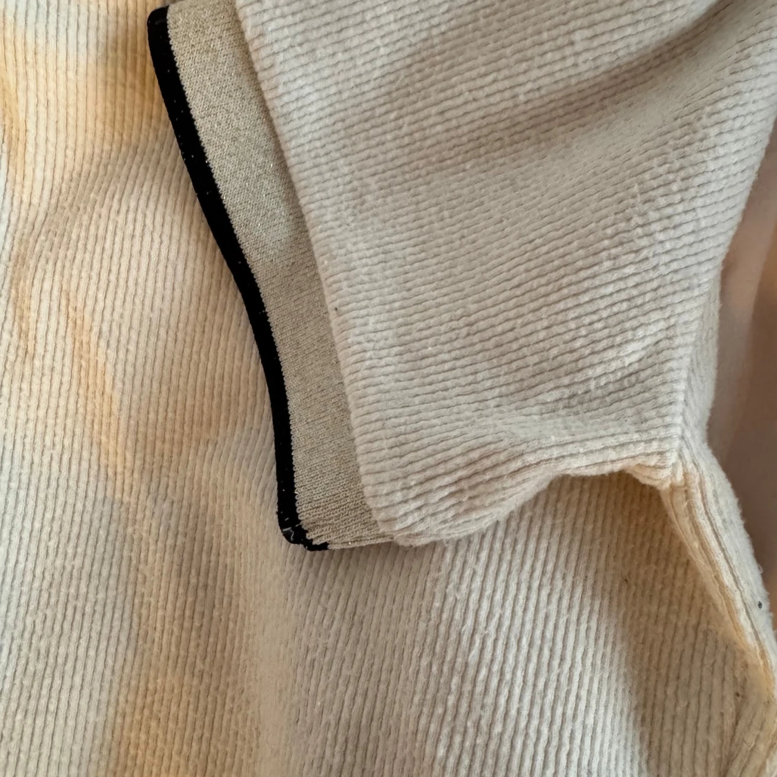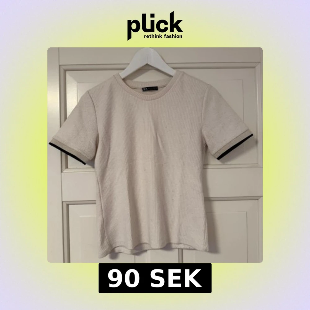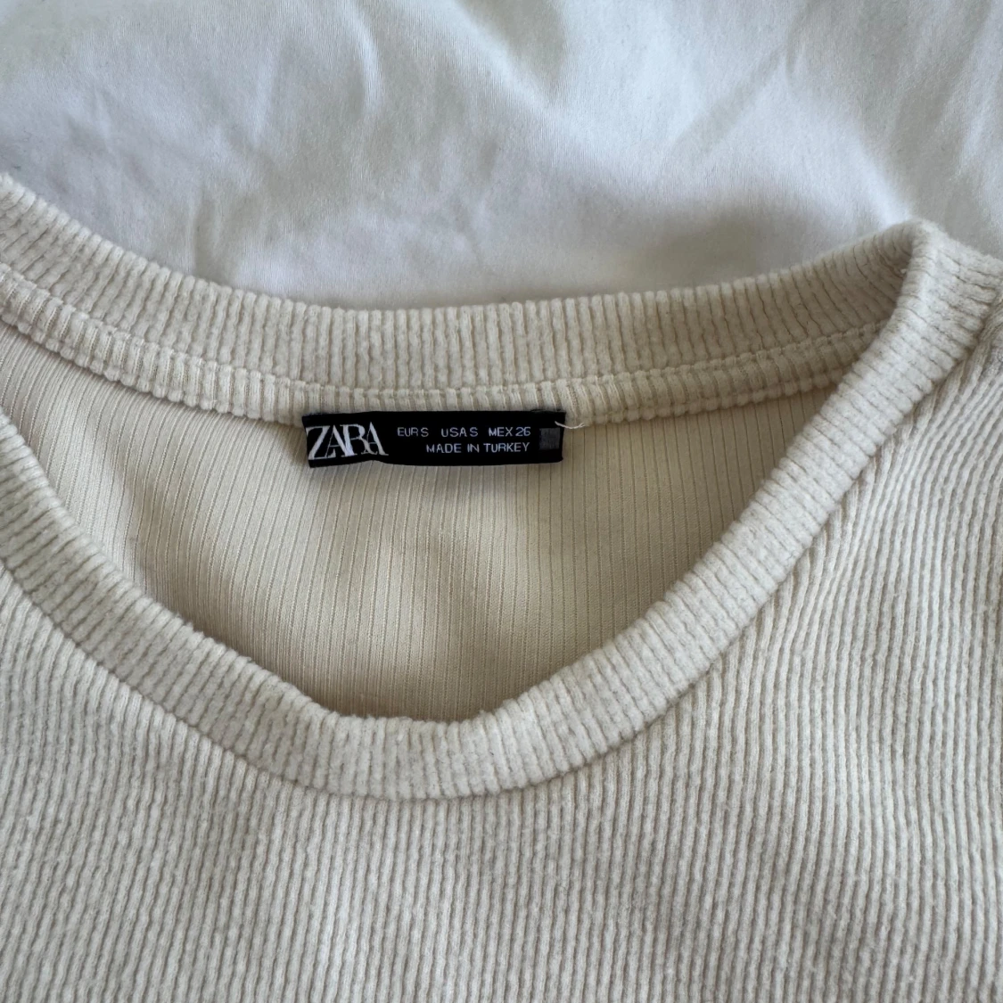 Snygg ribbad t-shirt från Zara i ljusvit färg med svarta detaljer på ärmsluten. Modellen har rund hals och korta ärmar, perfekt för en chill och clean look. Materialet är mjukt och känns som bomull, vilket gör den skön att bära hela dagen.