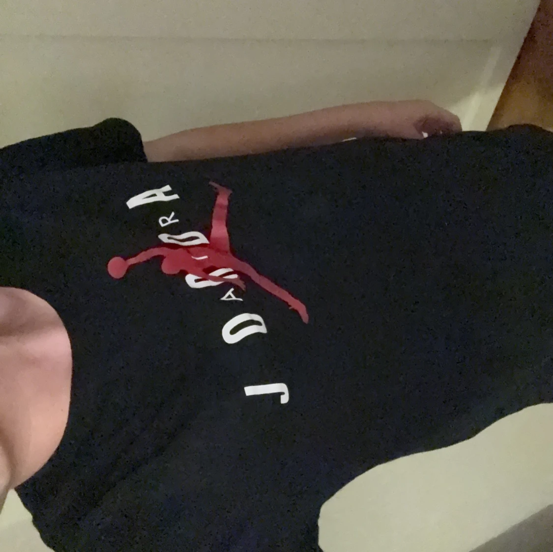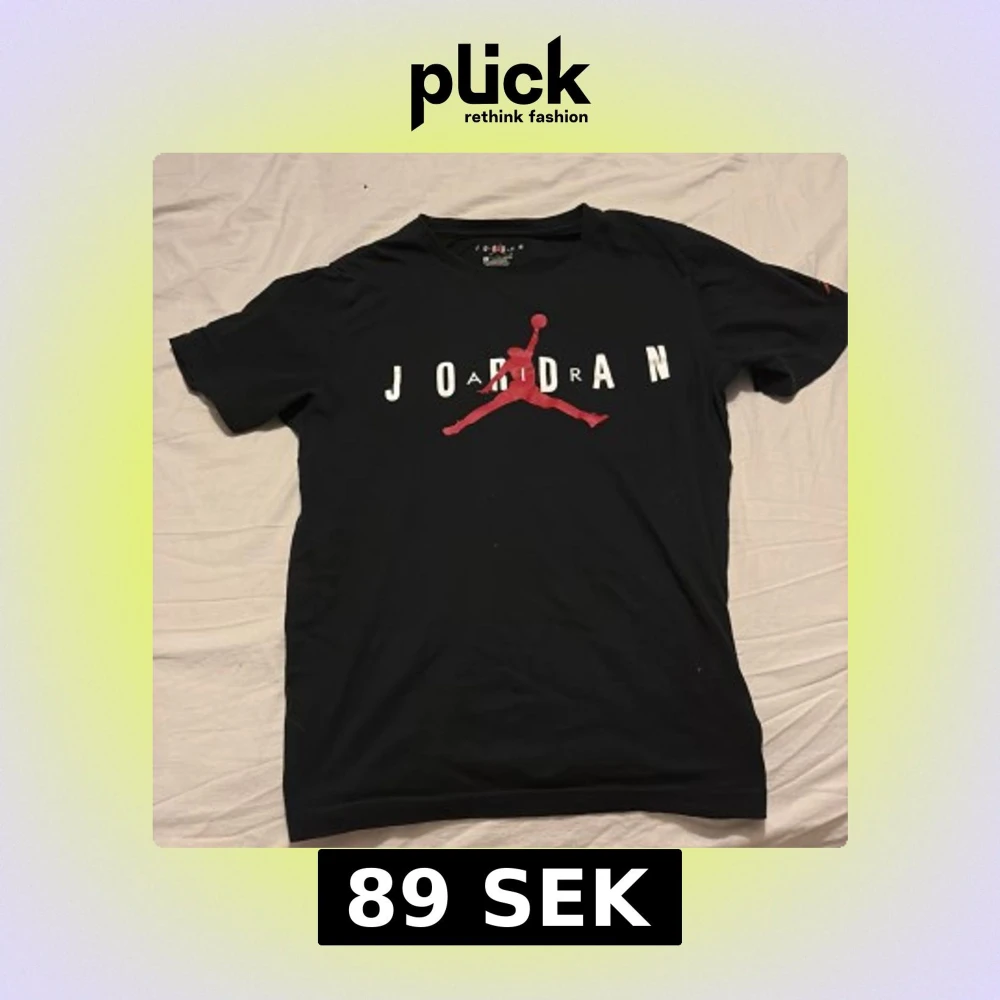 Säljer en svart t-shirt från Jordan med det ikoniska röda Jumpman-logotypen och vit text på framsidan. T-shirten är kortärmad och perfekt för en sportig look.