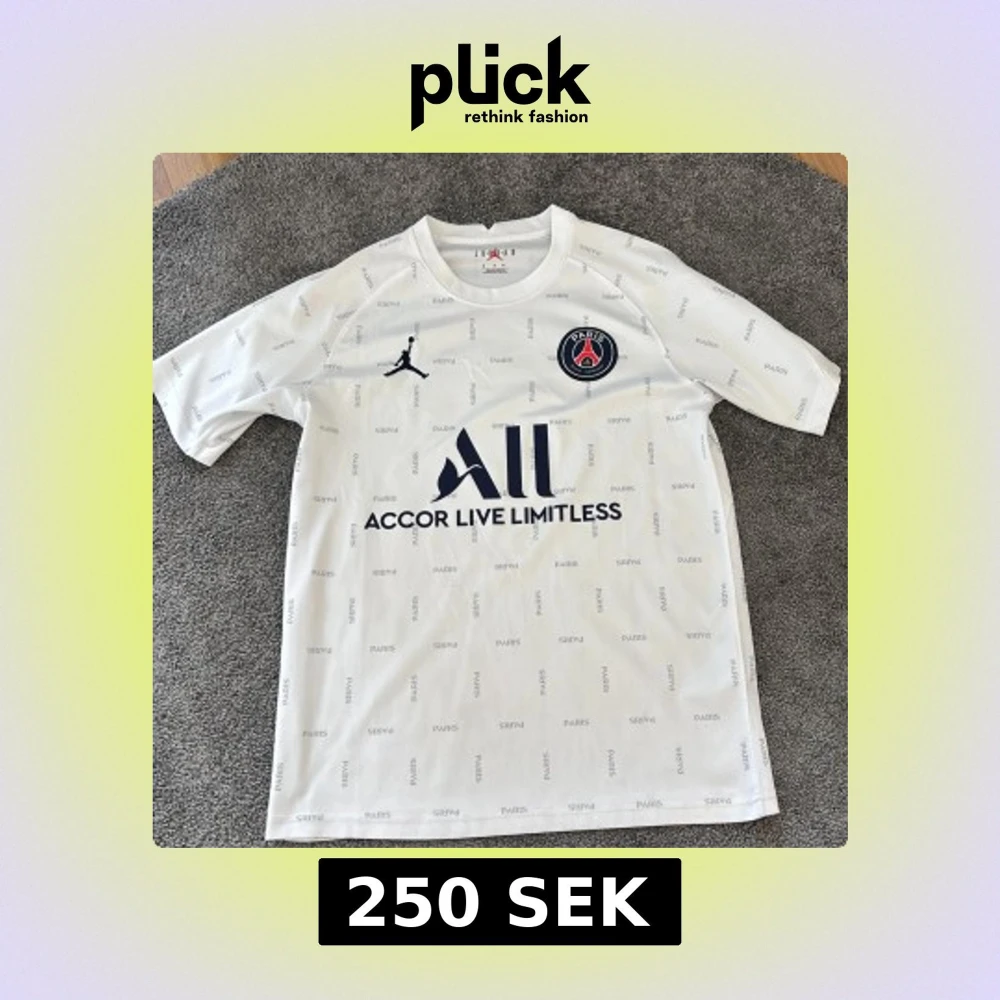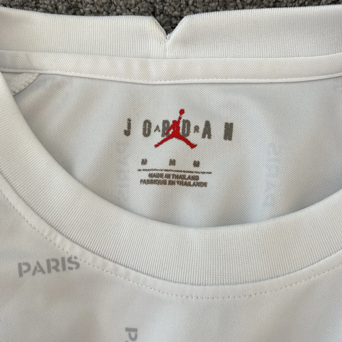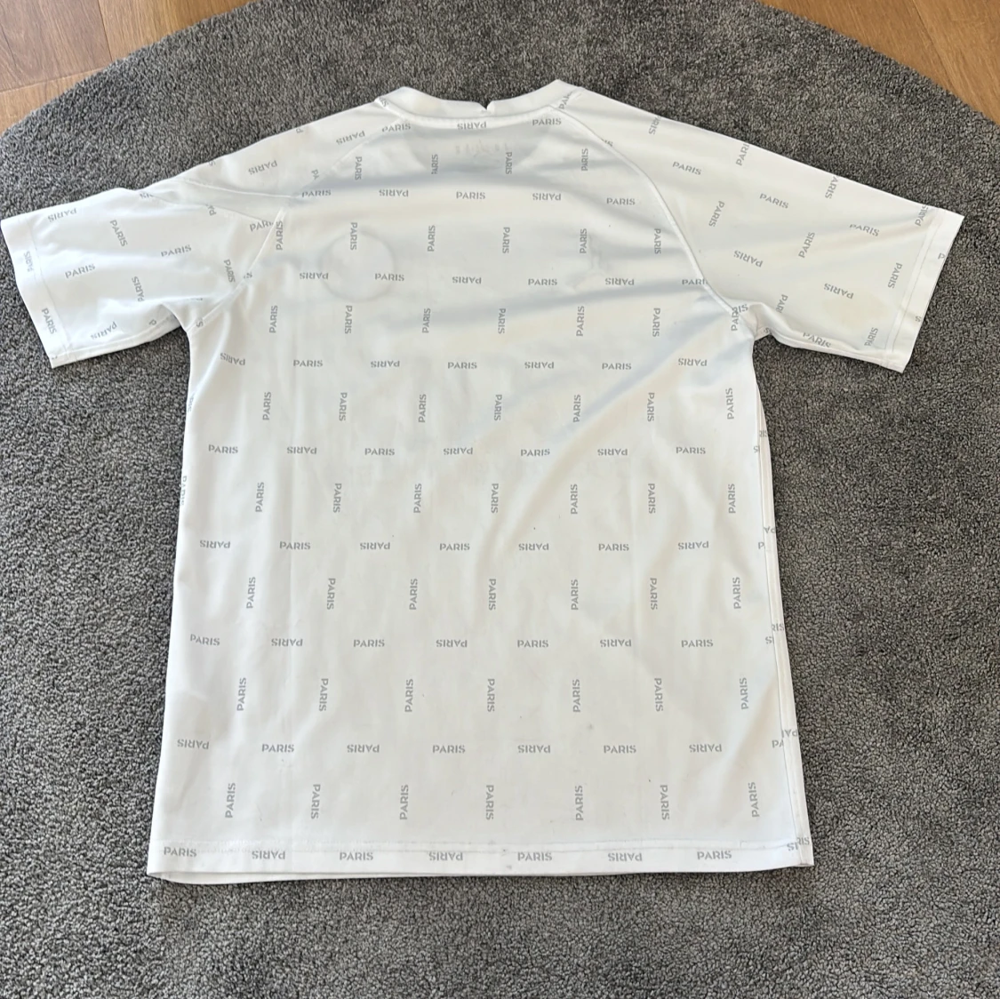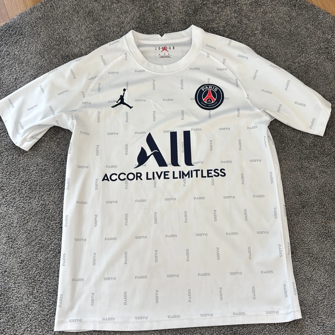 Säljer en vit PSG fotbollströja från Jordan med diskret grå textmönster och klubbmärke på bröstet. Tröjan har korta ärmar och rund hals. Stora svarta loggor på framsidan och tillverkad i lätt, ventilerande material. Skriv för mer information😀