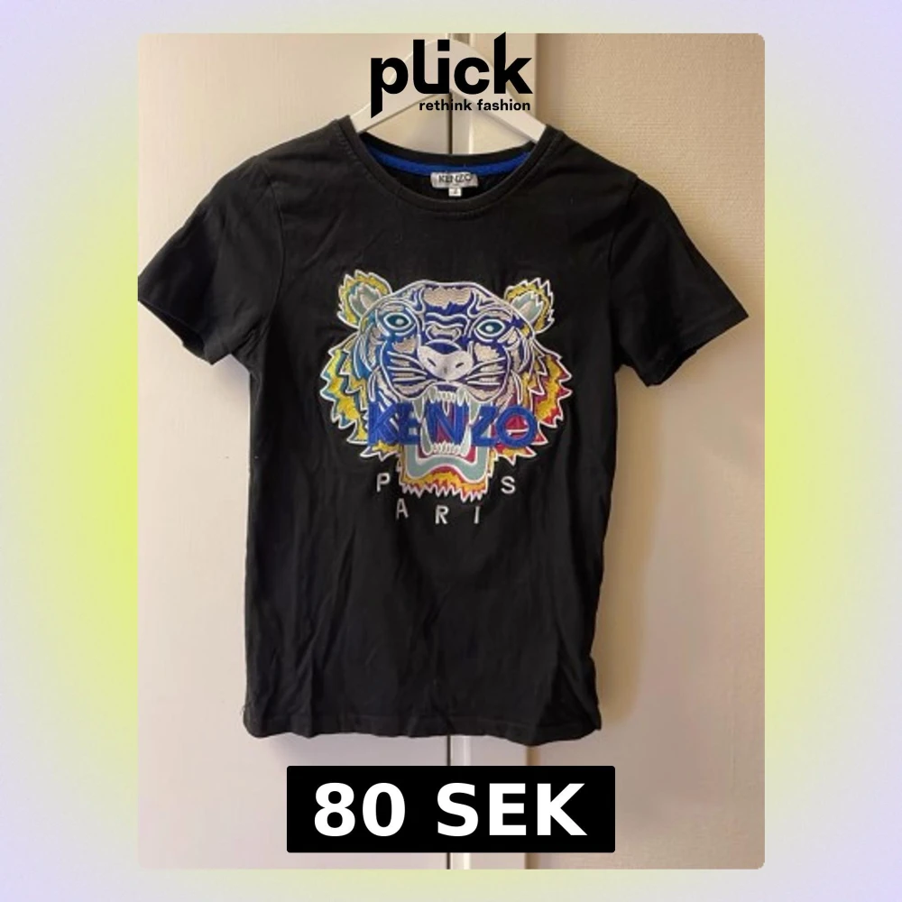 Säljer en svart t-shirt från Kenzo med ikoniskt broderat tigerhuvud i flera färger och texten 'Kenzo Paris' framtill. T-shirten har rund hals och korta ärmar, tillverkad i mjuk bomull. Perfekt för dig som vill sticka ut med en cool designerlook.