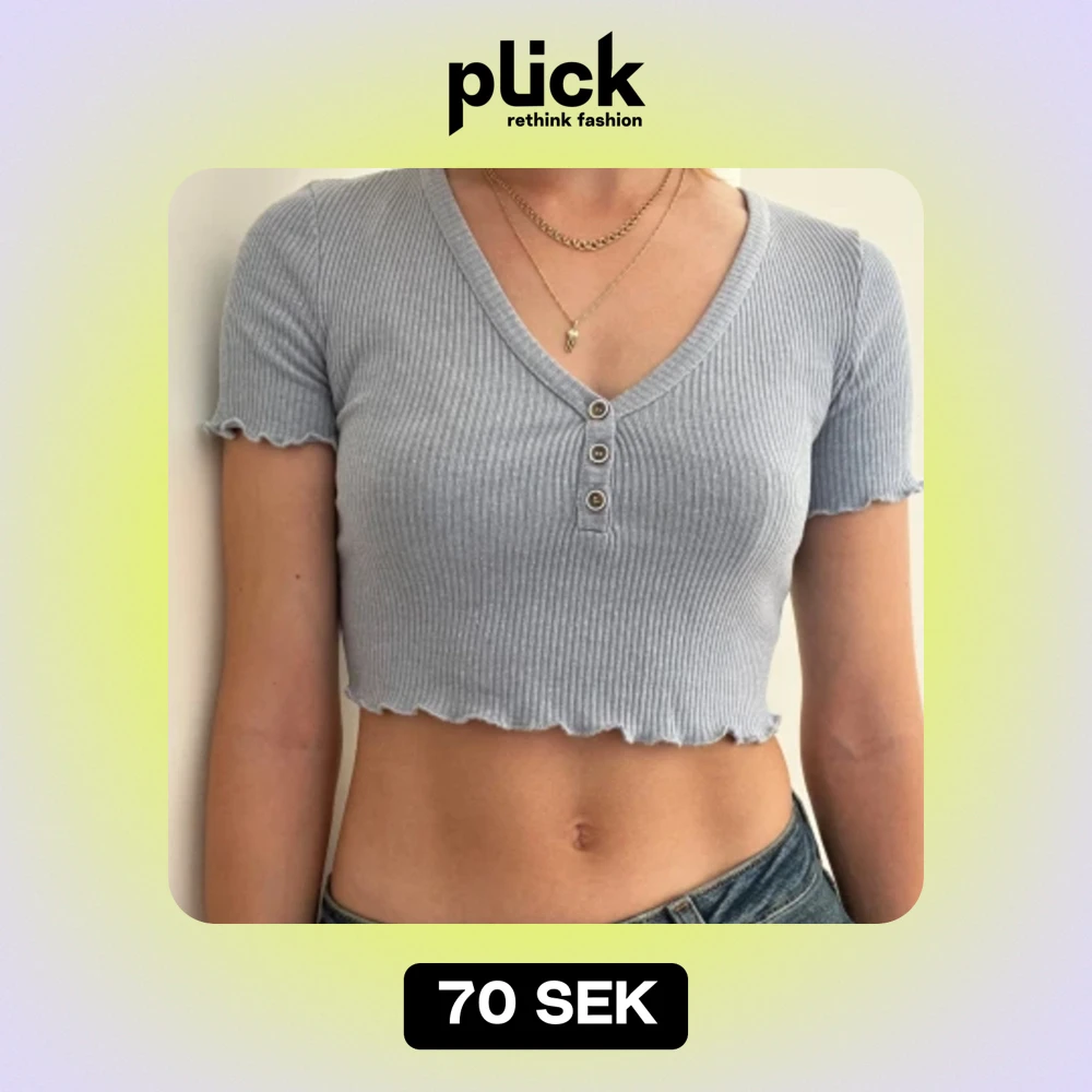 Gråblå croppad T-shirt i storlek S i gott skick!! Tröjan är V-ringad med knappar och har räffliga ärmar och midja.