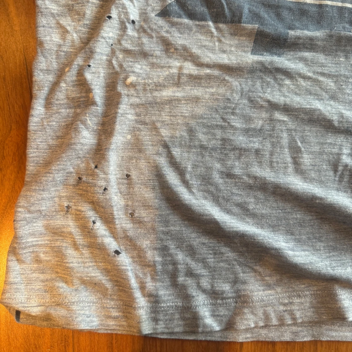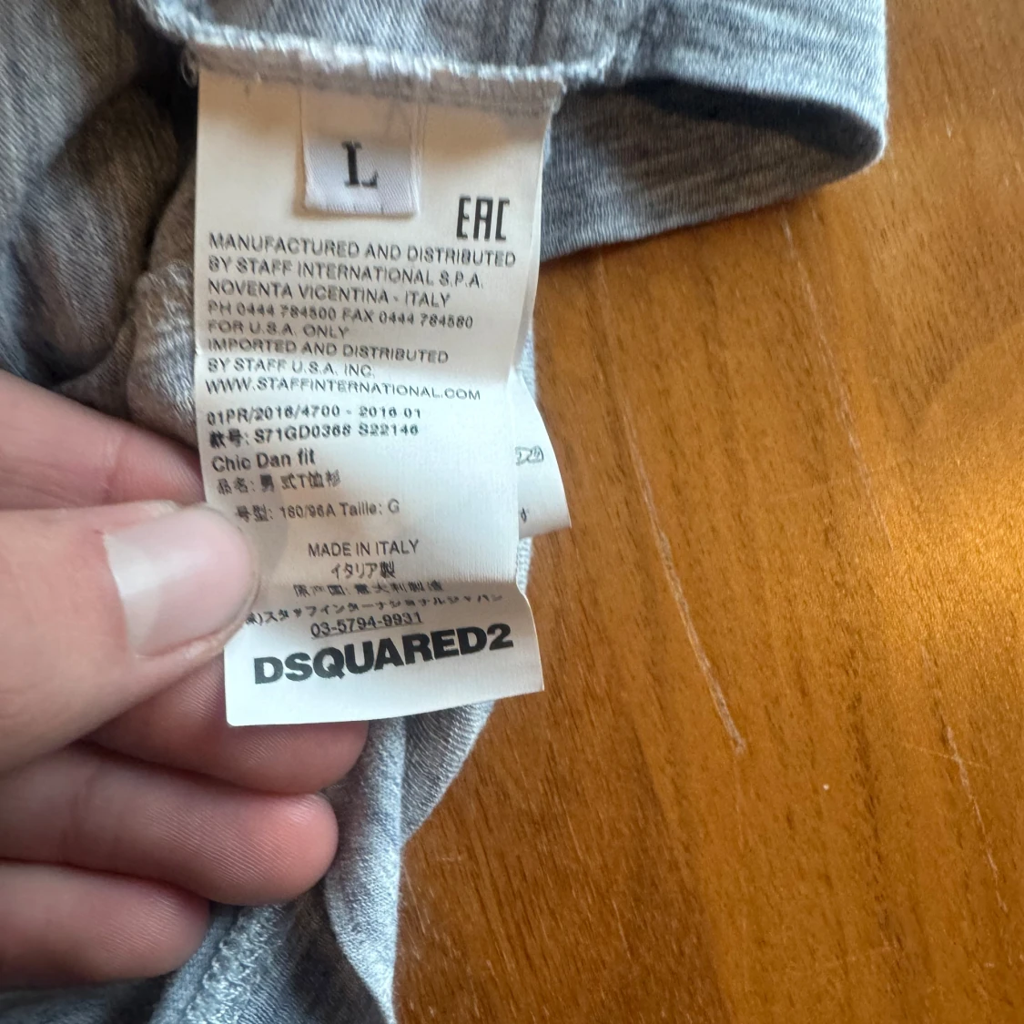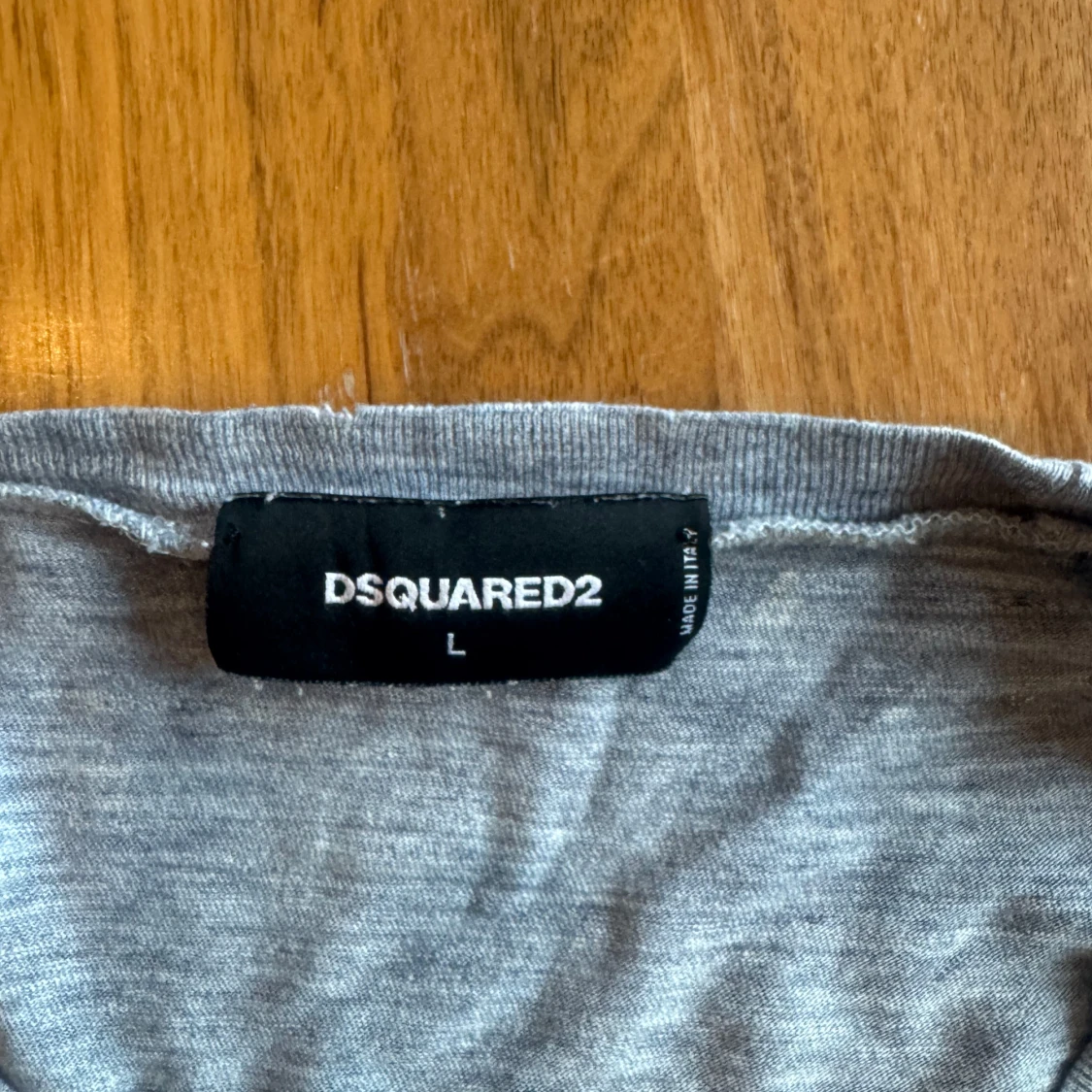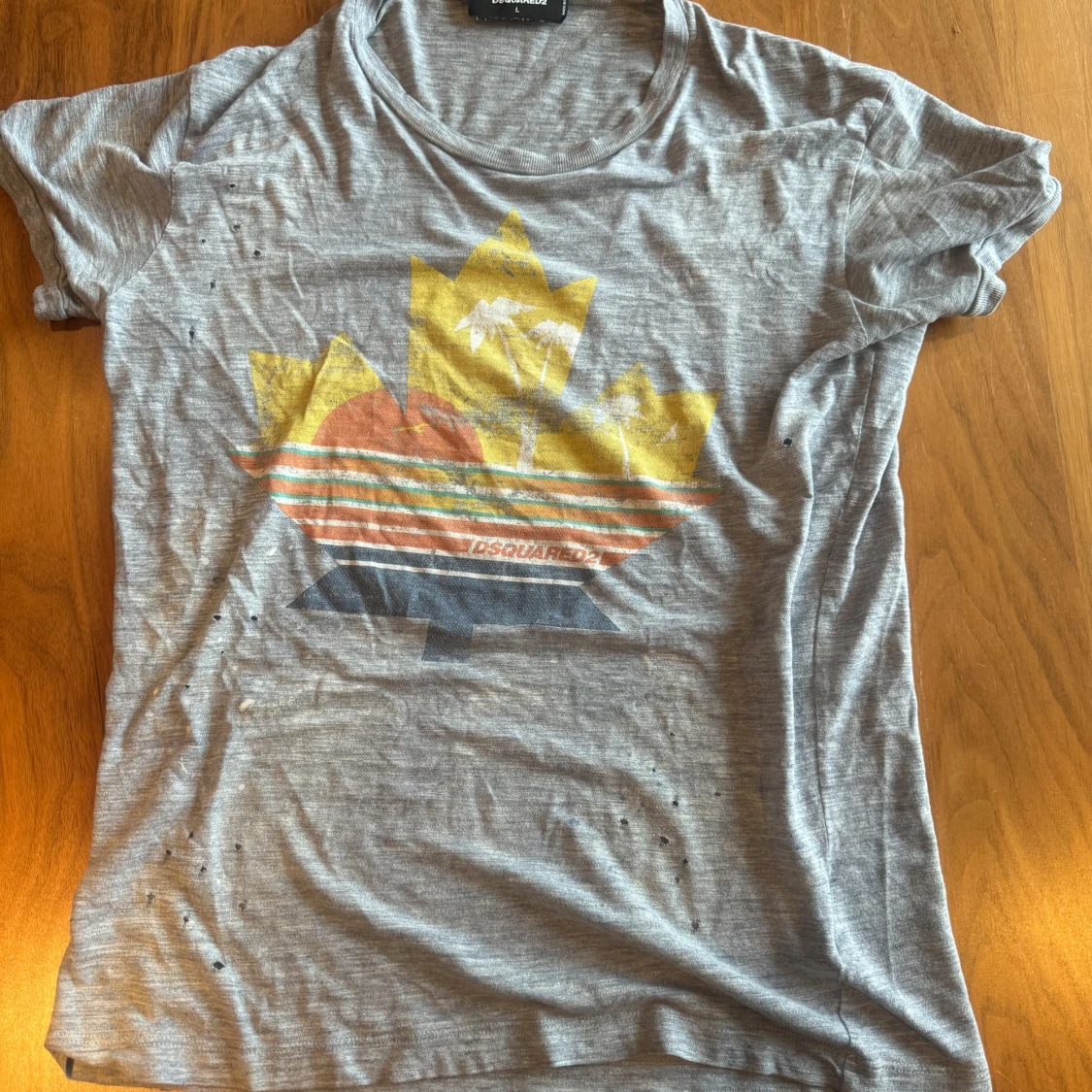 Säljer denna gråa t shirt ifrån dsquared2. Säljer den då den inte är min stil längre. Har haft den i några år nu. Tröjan är storlek L. OBS alla hål och färg skvättar ska vara där då det är del av designen. Tröjan är äkta