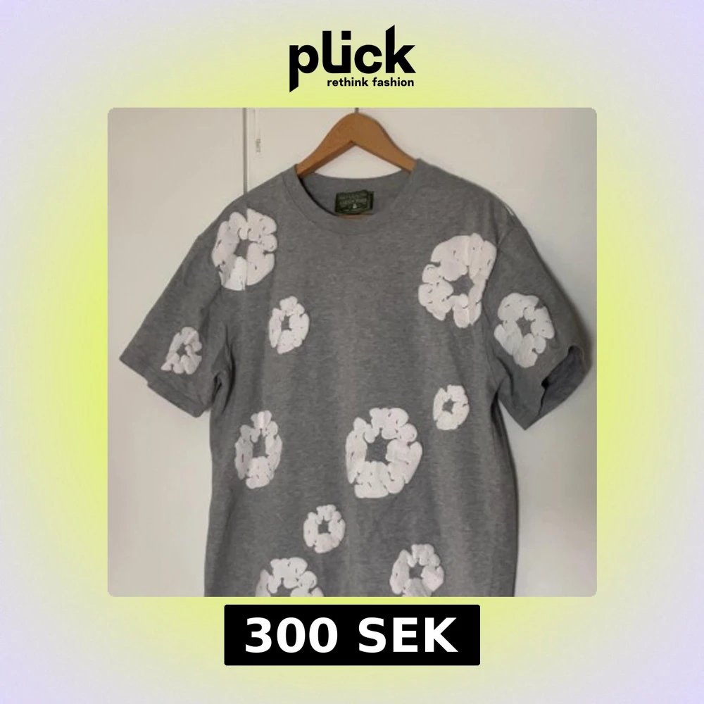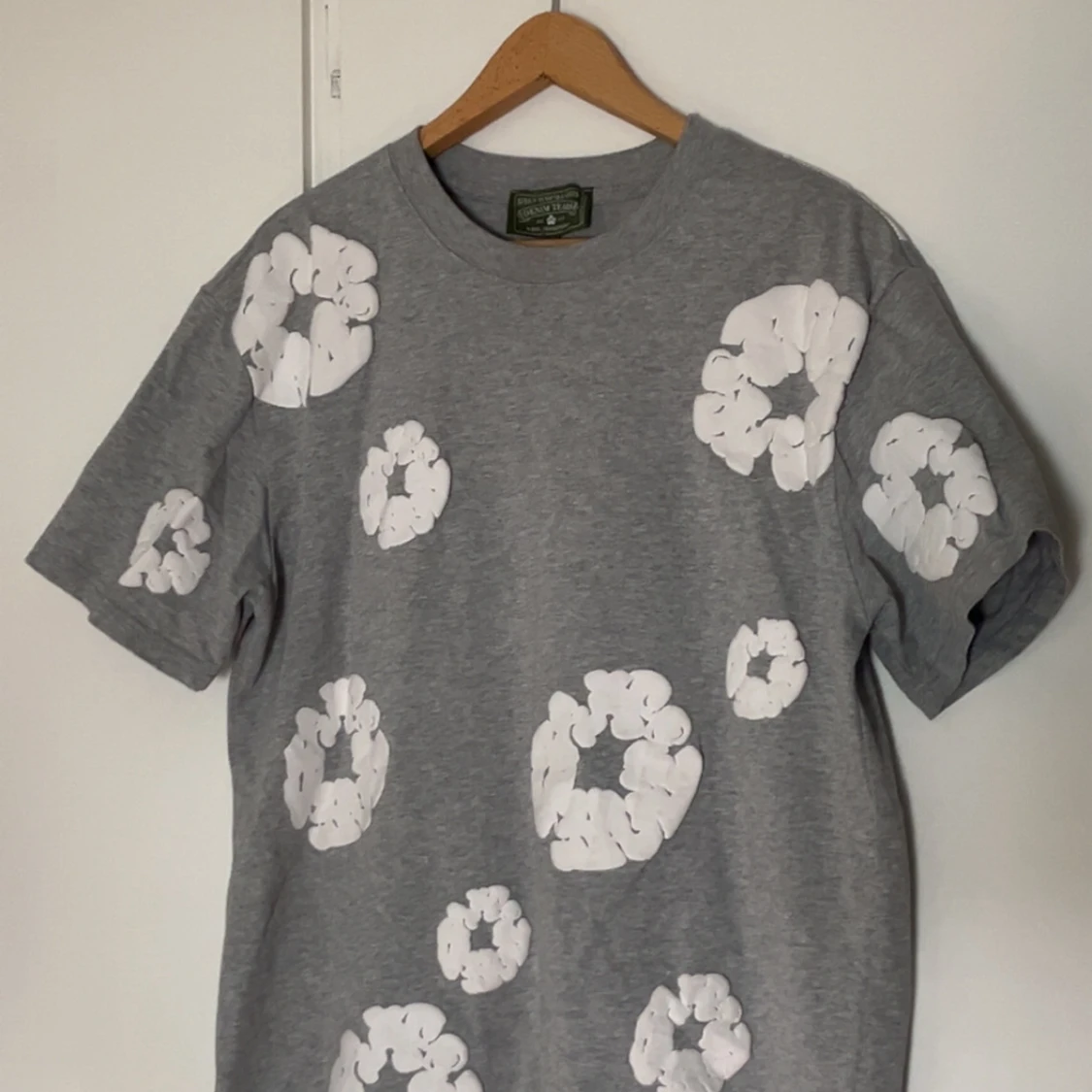 Grå t-shirt från Denim Tears med stora vita blommiga tryck över hela plagget. Klassisk passform med rund hals och korta ärmar. Tillverkad i 100% bomull för en skön känsla. Perfekt för dig som vill sticka ut med en unik och trendig look.