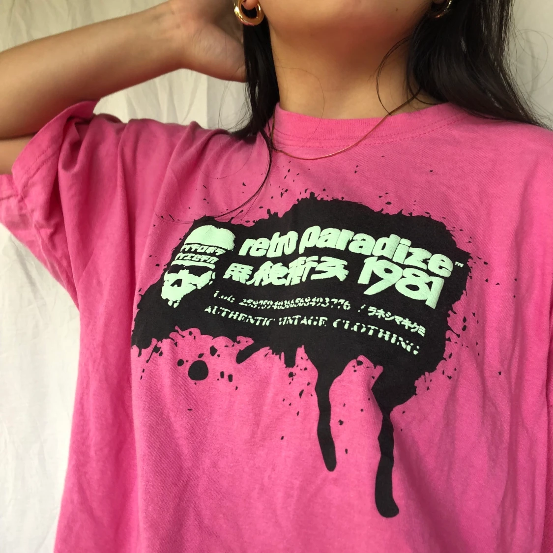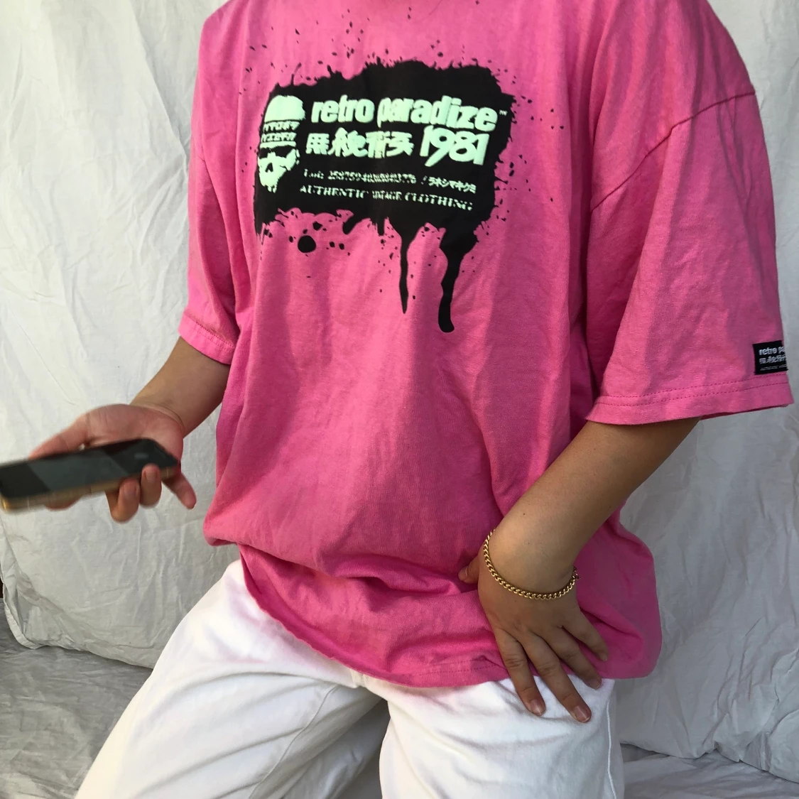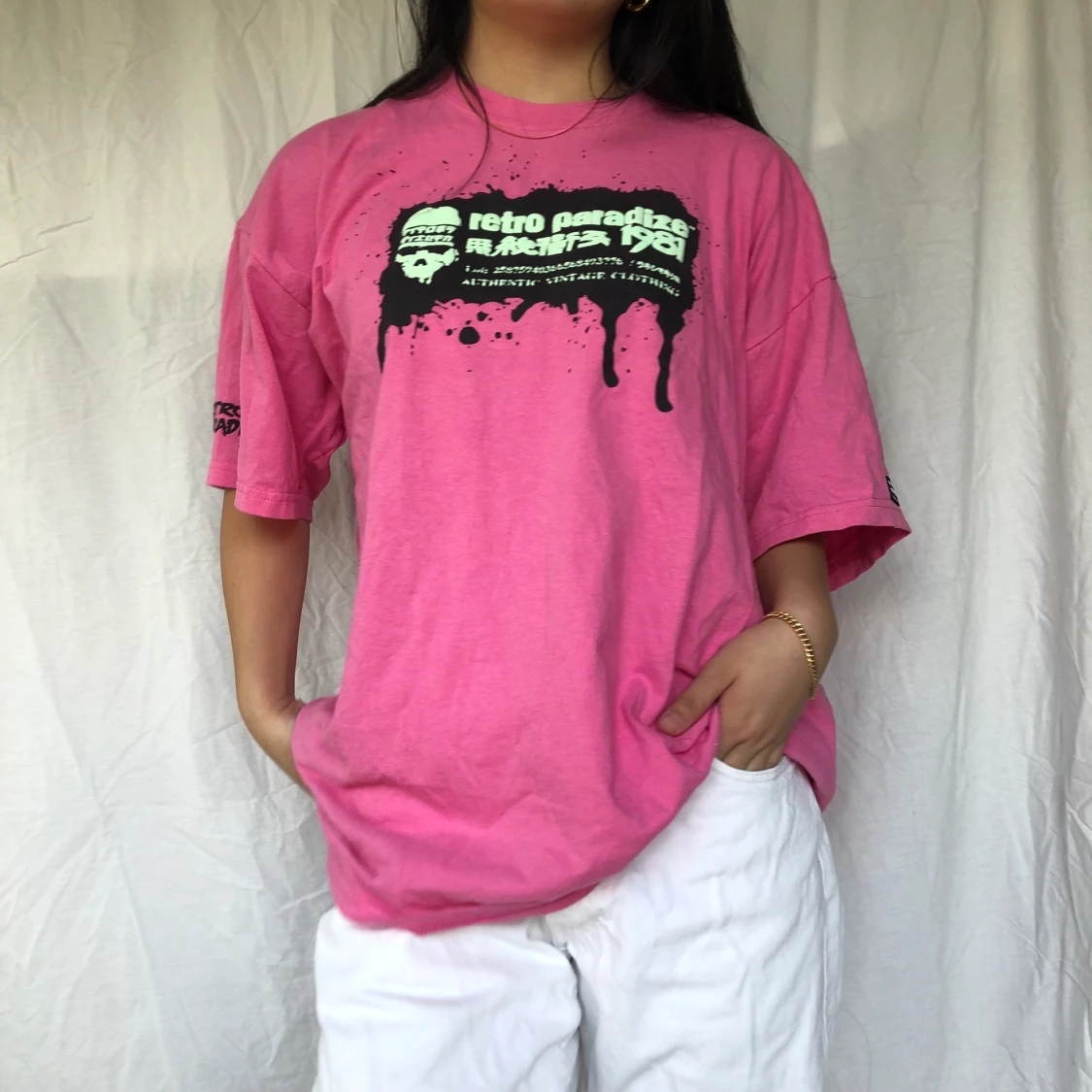 En skitcool rosa T-shirt med tryck (som ska lysa i mörkret, aldrig anvĂ€nd sĂ„ vet inte helt!). Strl L. Köpt i en liten shop i Paris. Köparen stĂ„r för frakten. đ