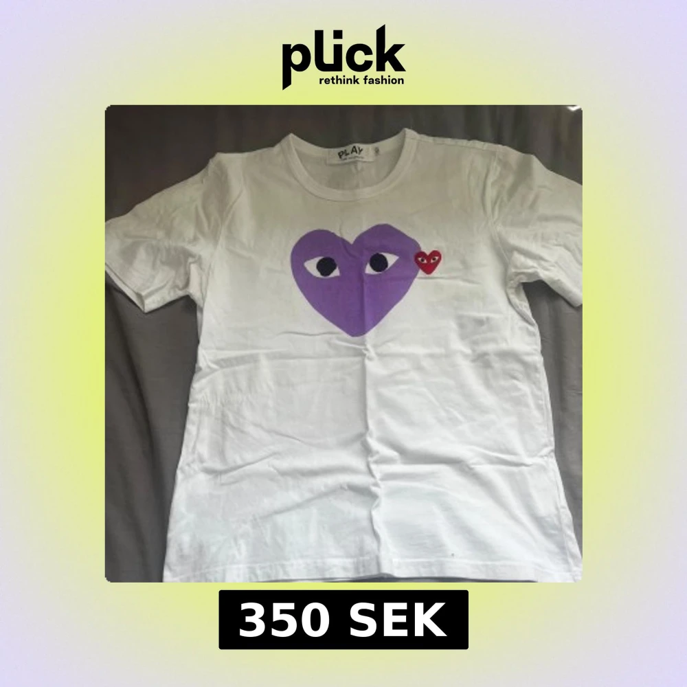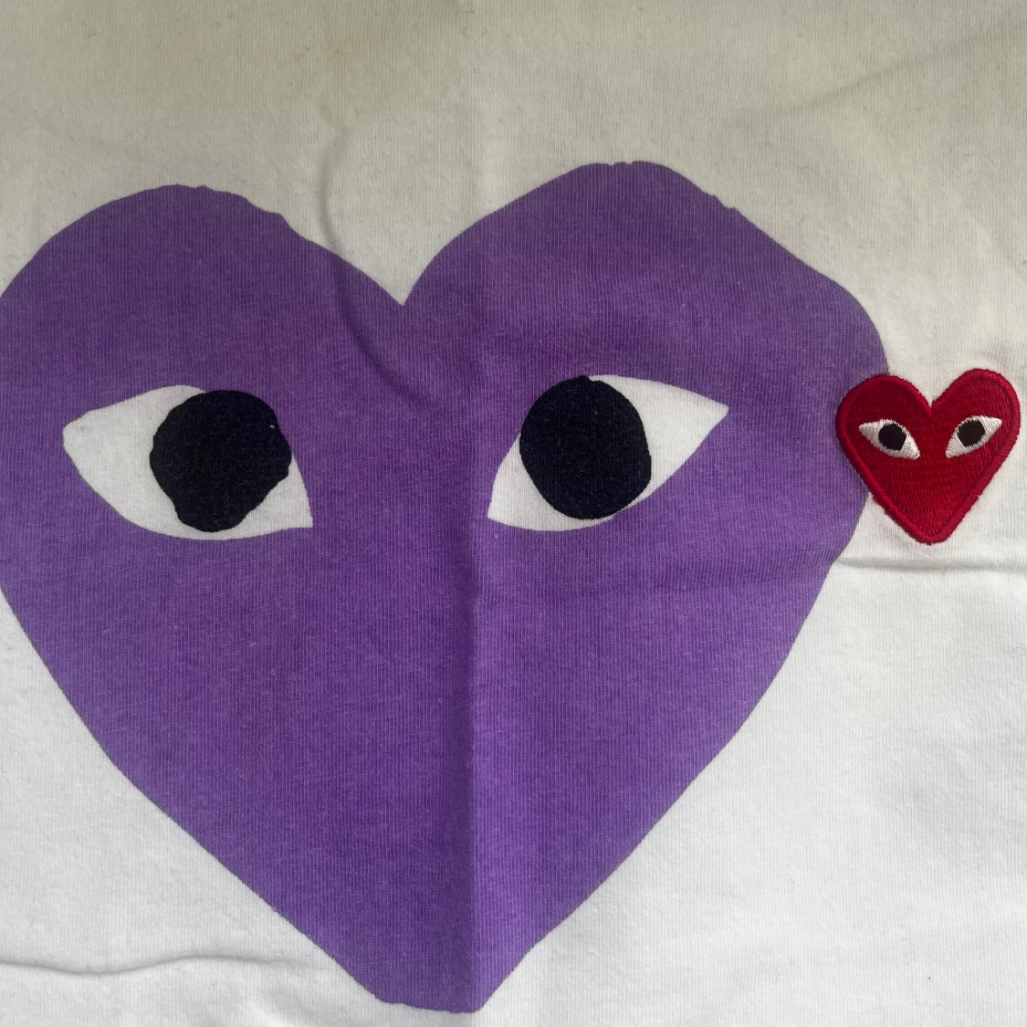 Vit t-shirt från Comme des Garçons PLAY med stort lila hjärta och ögon tryckt på bröstet samt ett litet rött hjärta broderat bredvid. Klassisk rund halsringning och korta ärmar. Perfekt statement-plagg för dig som gillar streetwear.