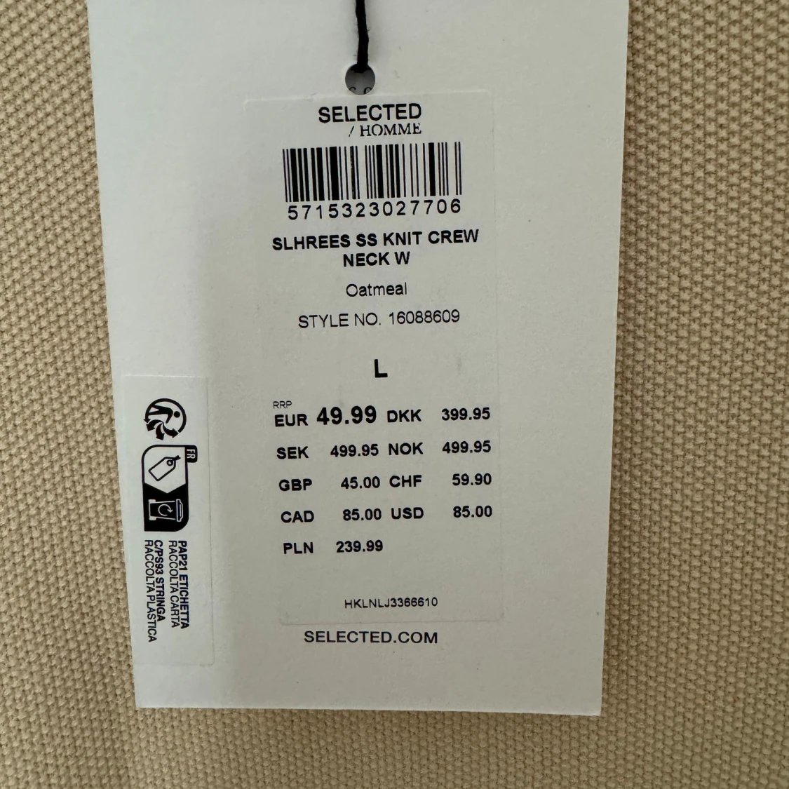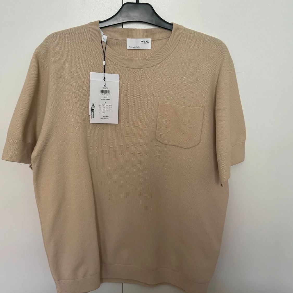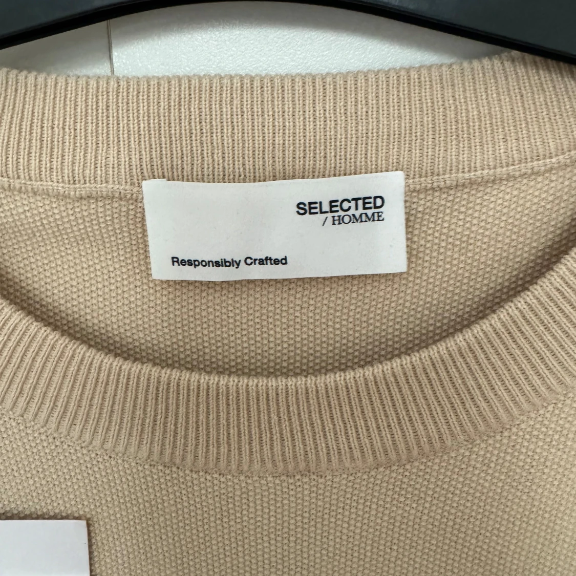 Säljer en stilren beige stickad tröja från Selected Homme. Tröjan har en rund hals och en bröstficka som ger en avslappnad look. Perfekt för en minimalistisk stil. Helt ny