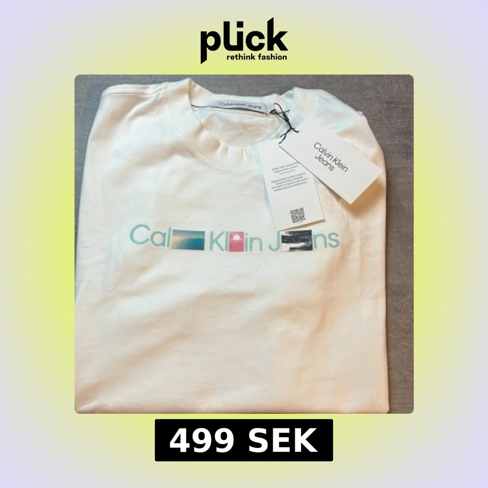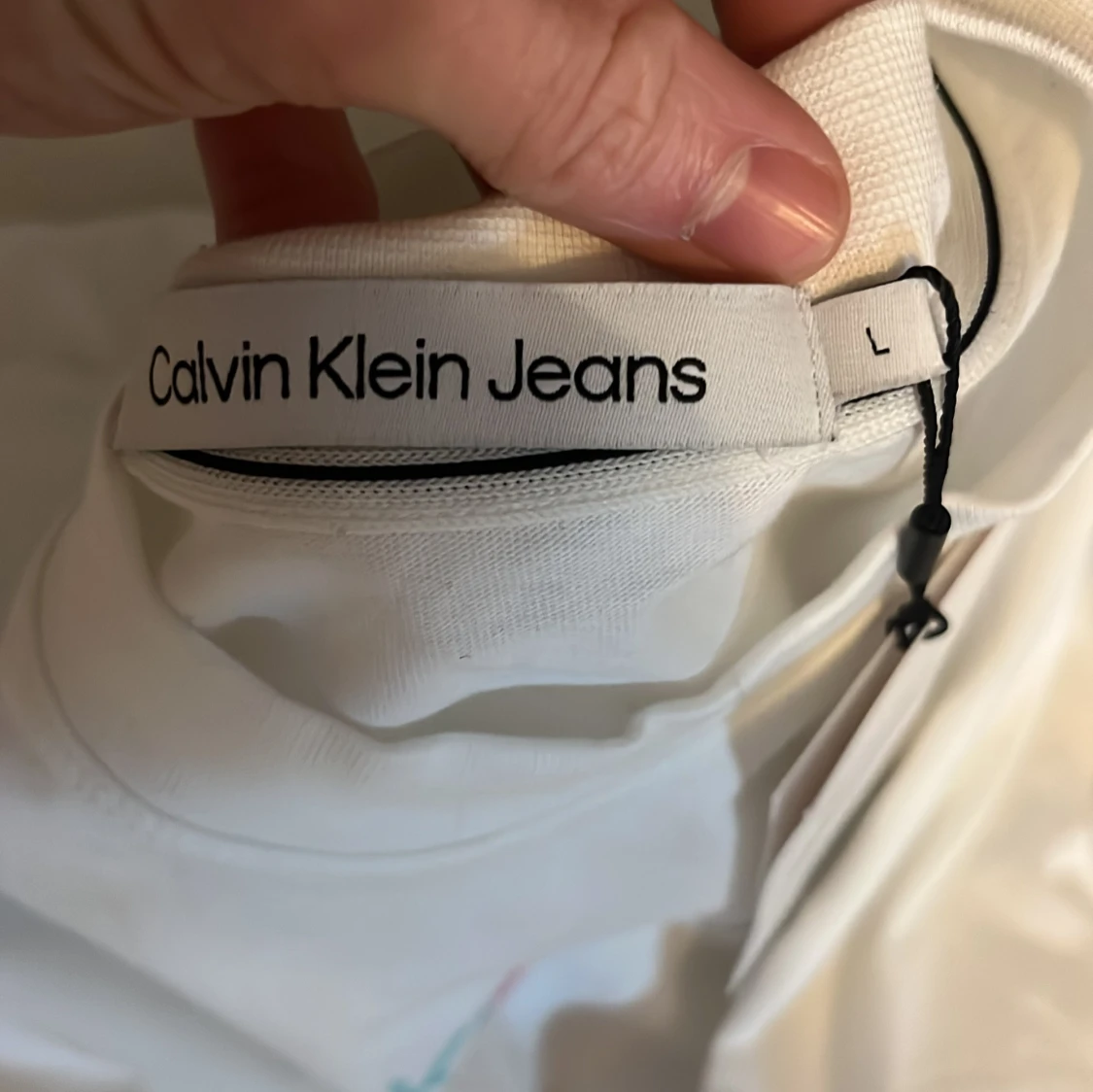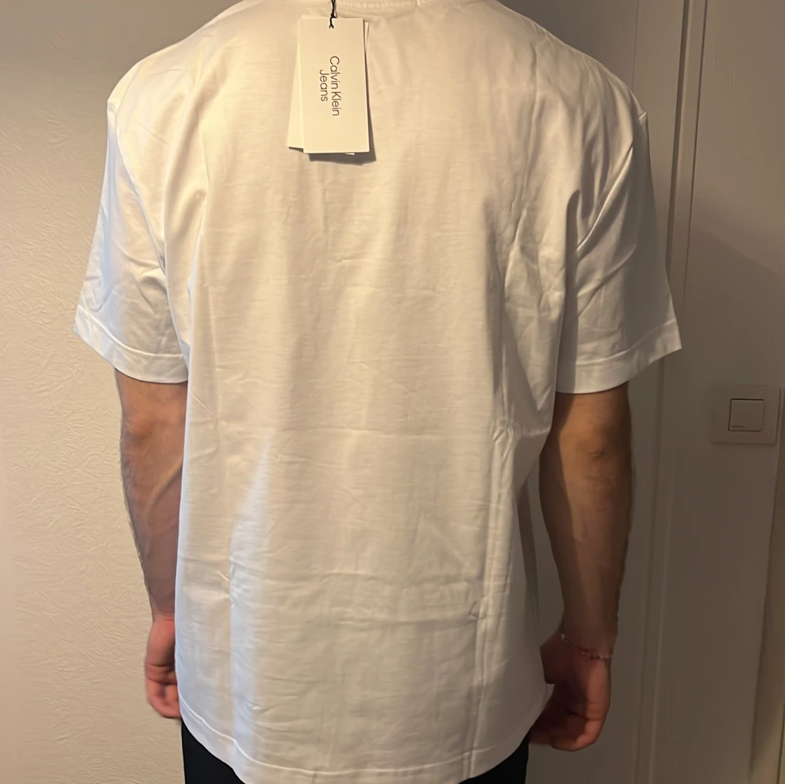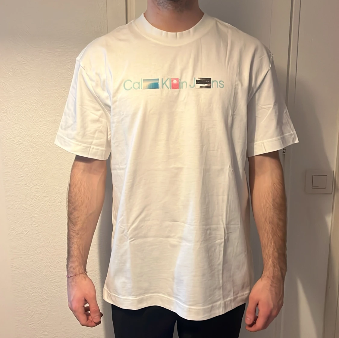 Säljer en stilren vit t-shirt från Calvin Klein med färgglatt tryck på bröstet. Perfekt för en avslappnad look. Modellen är 186 och väg 75 kg. Hör av er vid frågor!