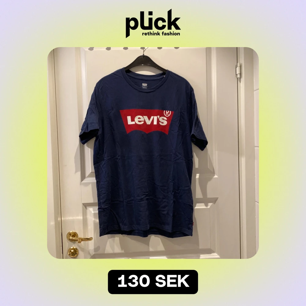 Säljer en snygg blå t-shirt från Levi's i storlek L. Den har en klassisk röd och vit logga på bröstet.