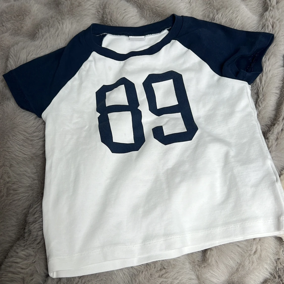 Säljer en sportig t-shirt från Lindex Kids i vitt med marinblå ärmar och trycket 89 på bröstet. Klassisk baseballstil med korta ärmar, perfekt för en avslappnad look.