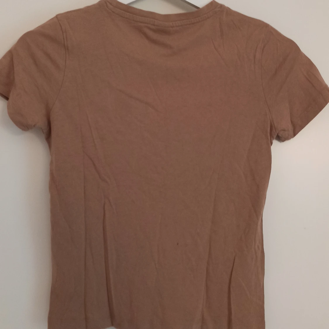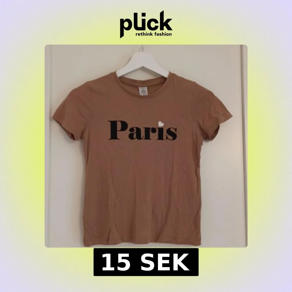 Snygg brun t-shirt från Lindex, svart Paris-tryck och vit hjärtdetalj. Rund hals och korta ärmar, tillverkad i mjuk bomull. Storlek 134/140, men kan passa större eftersom den är stretchig!💕 perfekt att växa i. Finns ett minimalt hål på baksidan (se bild)