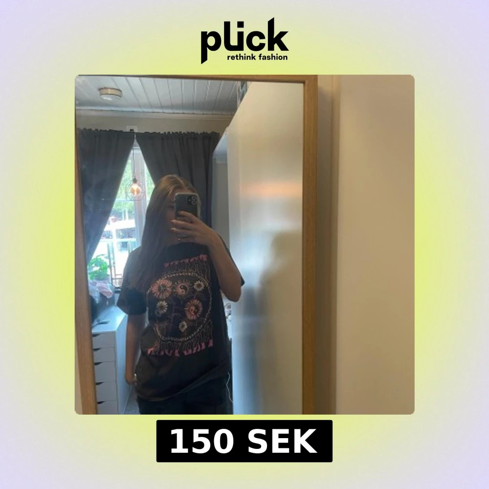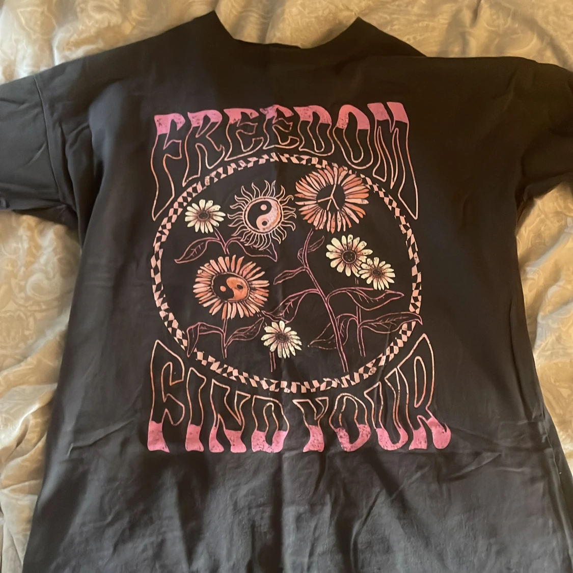 Säljer en grå t-shirt med ett coolt tryck i rosa och vitt. Texten 'FREEDOM FIND YOUR' omger ett motiv av blommor och ett yin-yang-tecken. Perfekt för en avslappnad stil.
