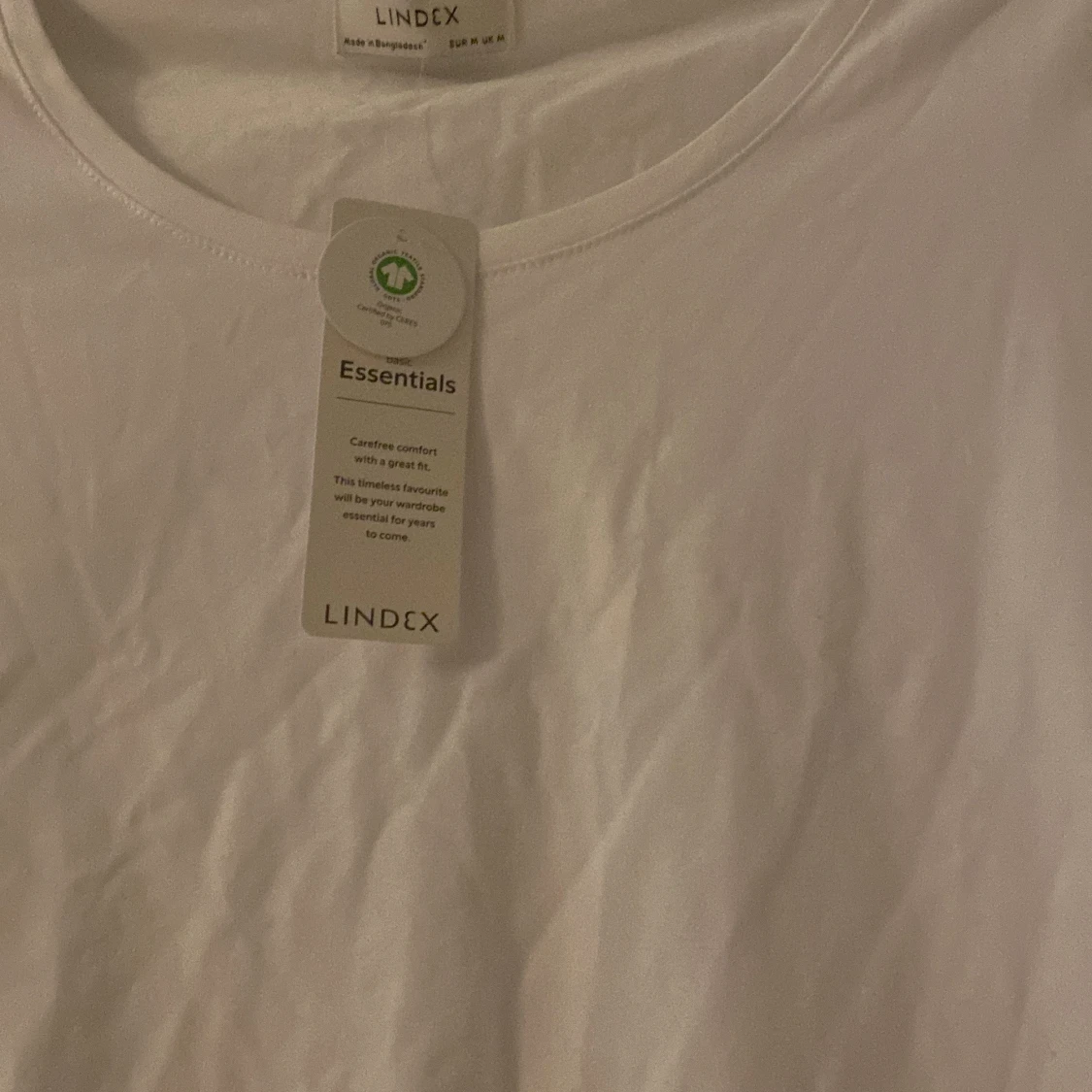 En klassisk vit t-shirt från Lindex Essentials med rund halsringning och korta ärmar. Gjord i mjuk bomull som känns skön mot huden. Perfekt att styla med jeans eller kjol för en clean och enkel look.