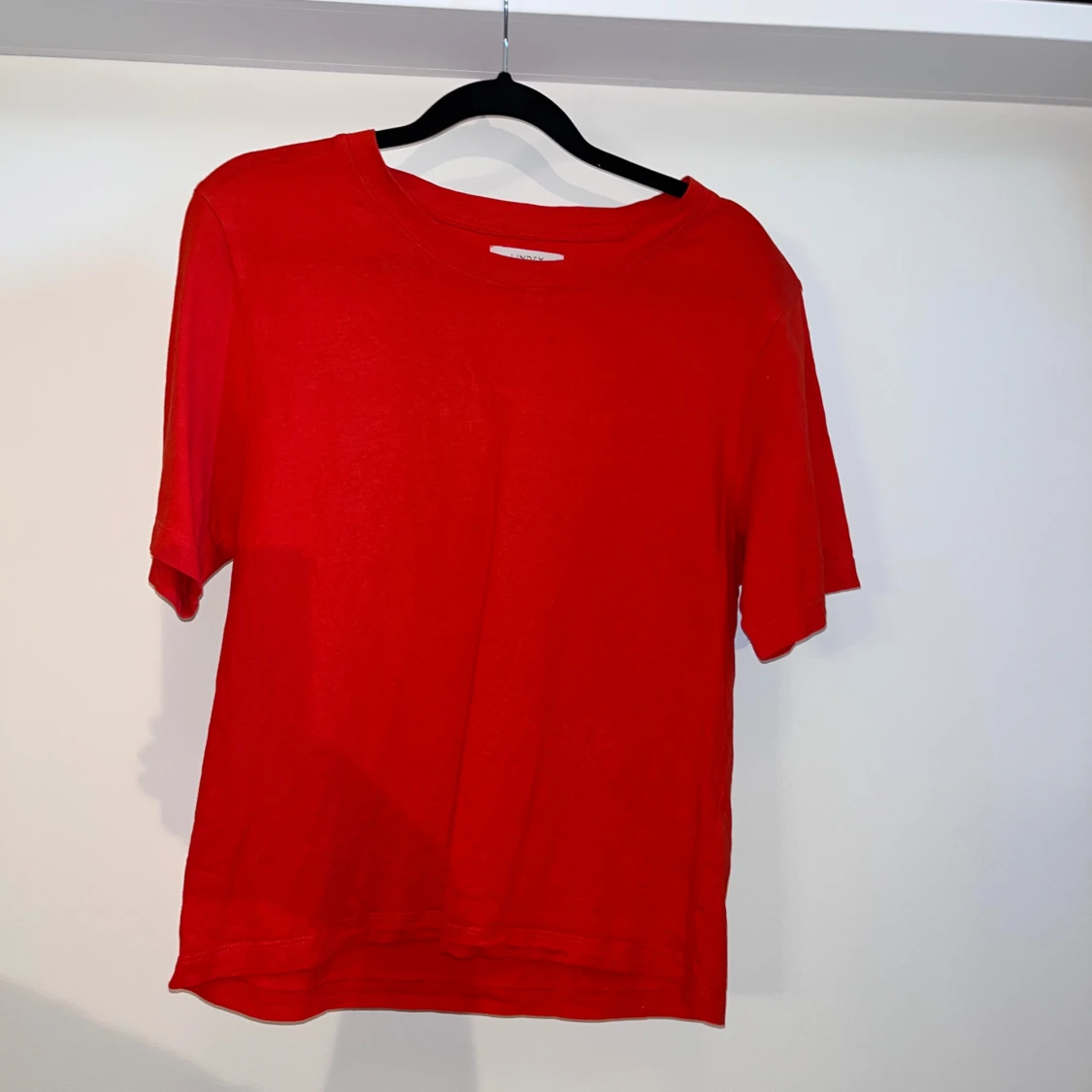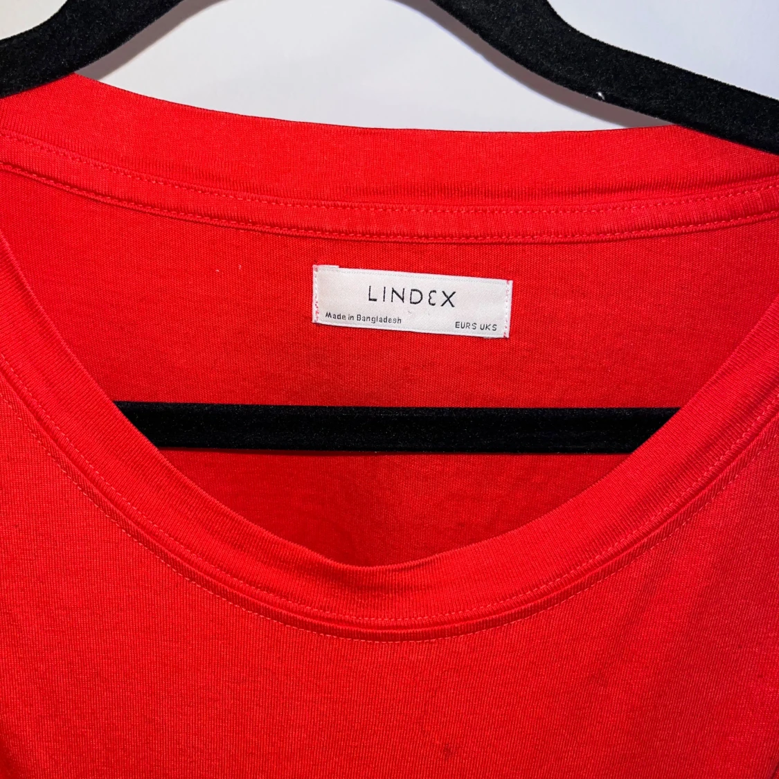 Enkel och stilren röd t-shirt från Lindex med korta ärmar. Tillverkad i mjuk bomull som känns skön mot huden. Använd en gång.