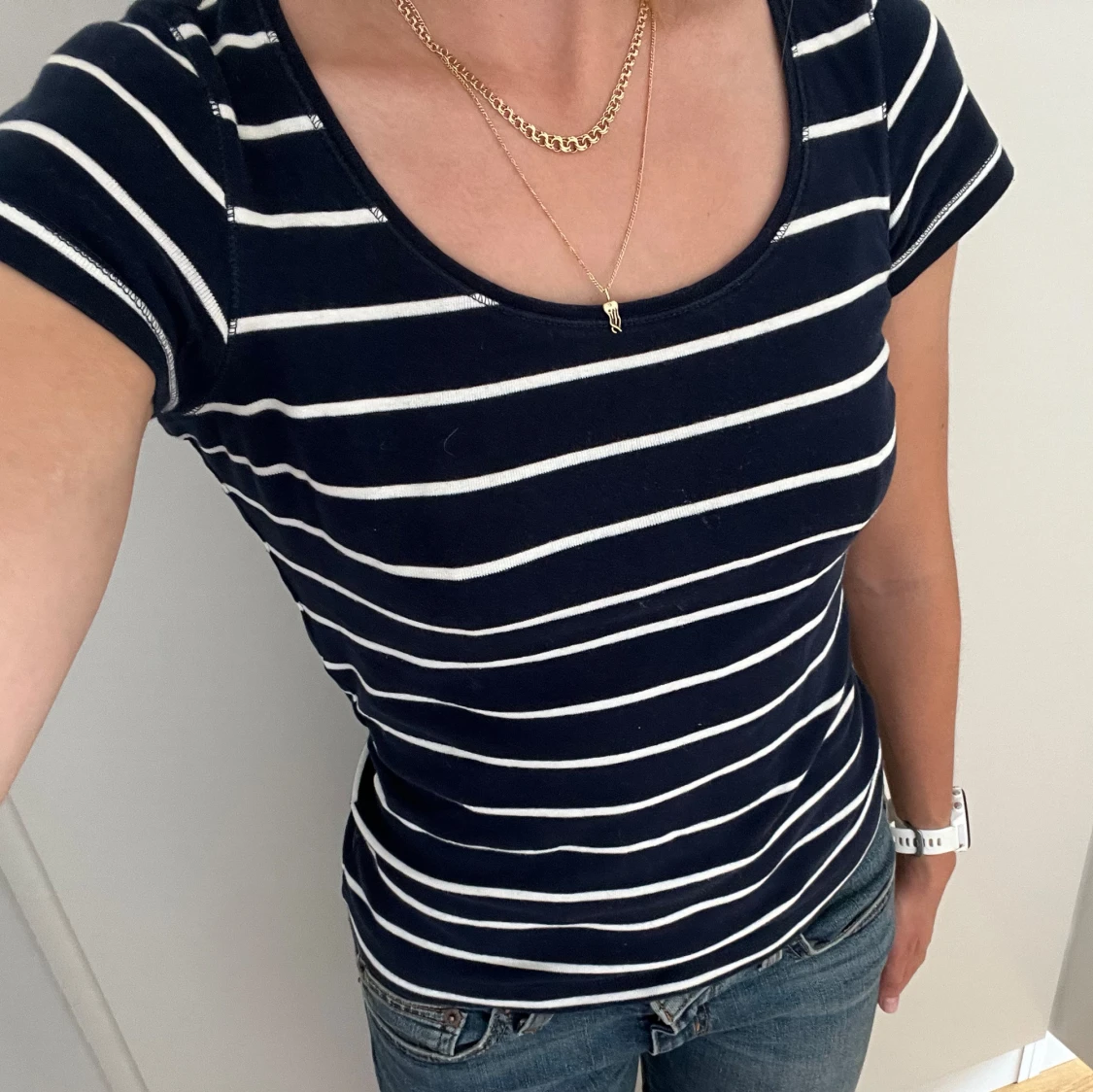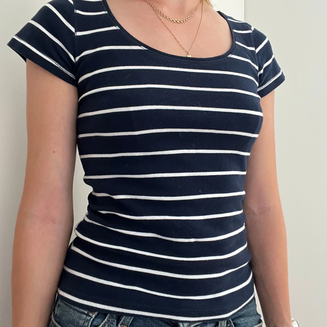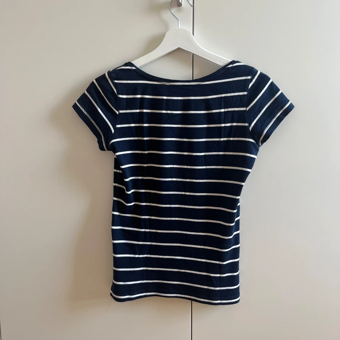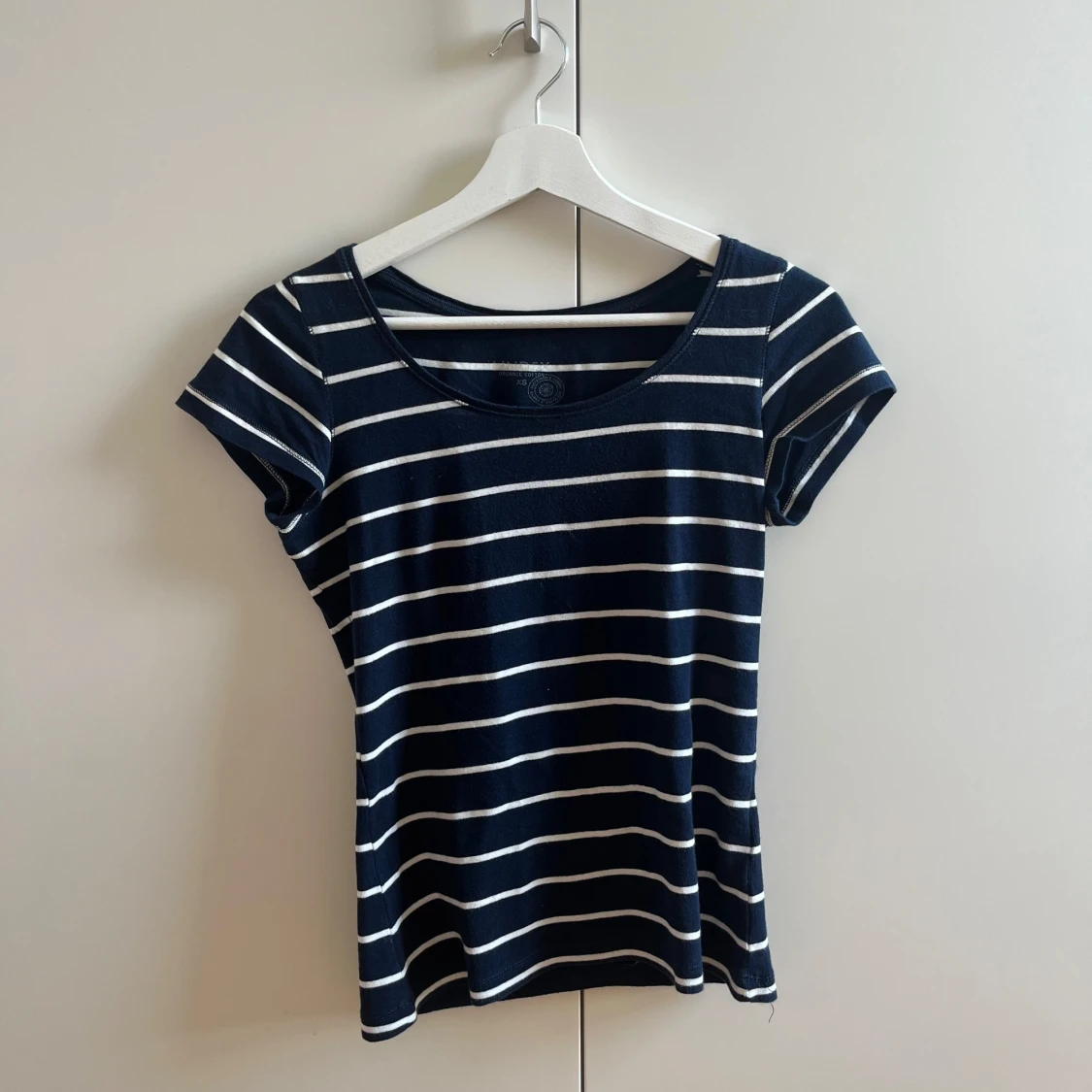 Vit randig marinblå T-shirt i storlek XS.