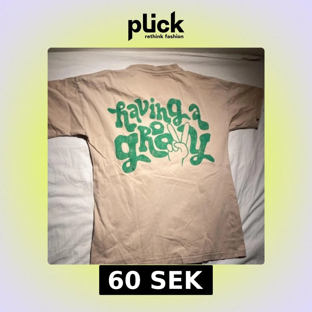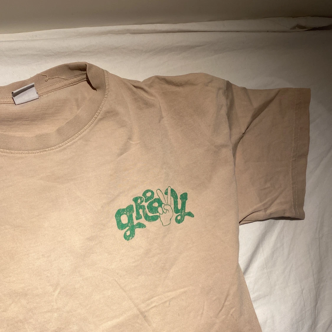 Säljer en beige t-shirt med grönt tryck 'having a gravy' på baksidan och 'gravy' på framsidan. Det är egentligen en oversized t-shirt för unga men kan användas som en helt vanlig t-shirt också!