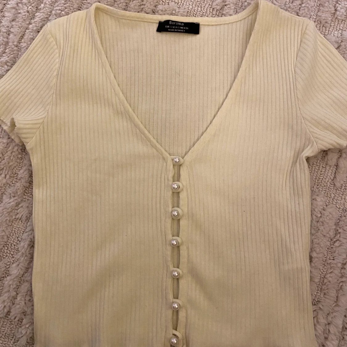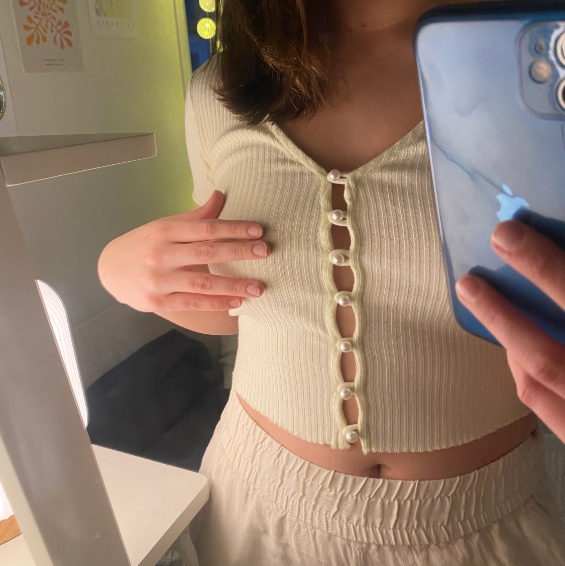 Så fin topp med vita pårlknappar💛 skicket är bra men den är använd! Ljusgul färg som tyvärr inte syns så bra på bild. Köparen står för frakten!