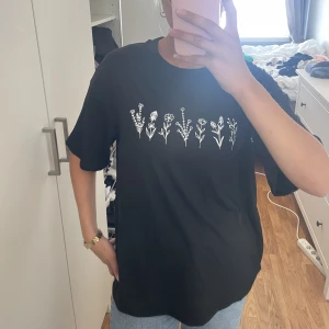 Grå t-shirt med blommor som tryck. Mjukt material men som samtidigt liknar träningsmaterial. Extremt stor i storlek, står XS men skulle säga att den är mer som en oversized medium. Jag själv brukar ha XS-S.