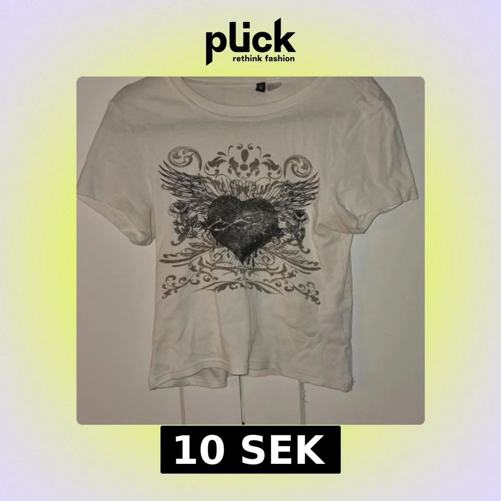 Säljer en vit t-shirt från H&M Divided med ett stort tryck av ett hjärta med vingar och dekorativa detaljer. T-shirten är kortärmad och har en normal passform. Perfekt för en avslappnad stil.