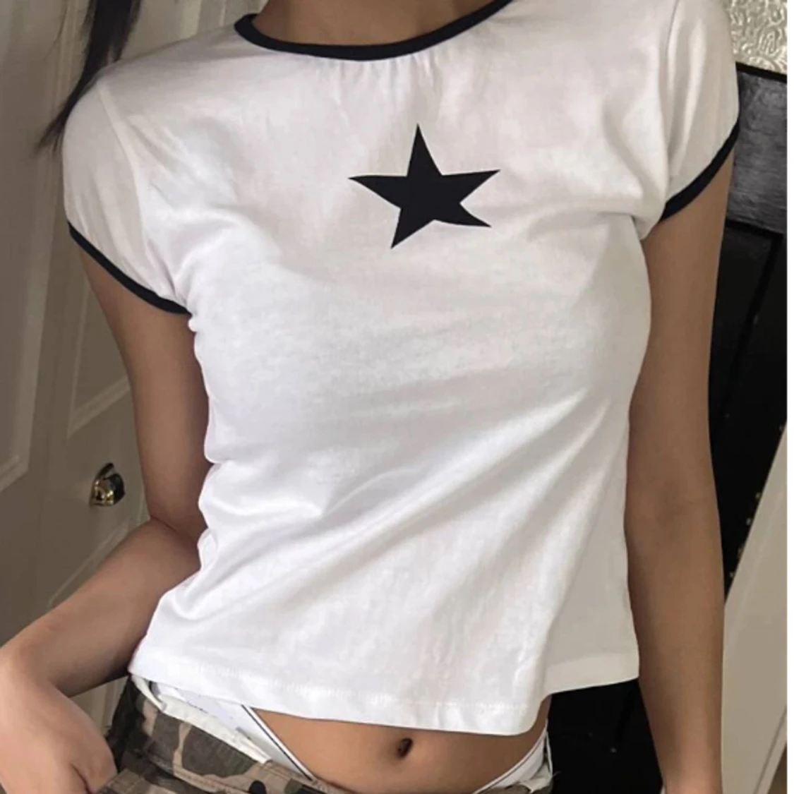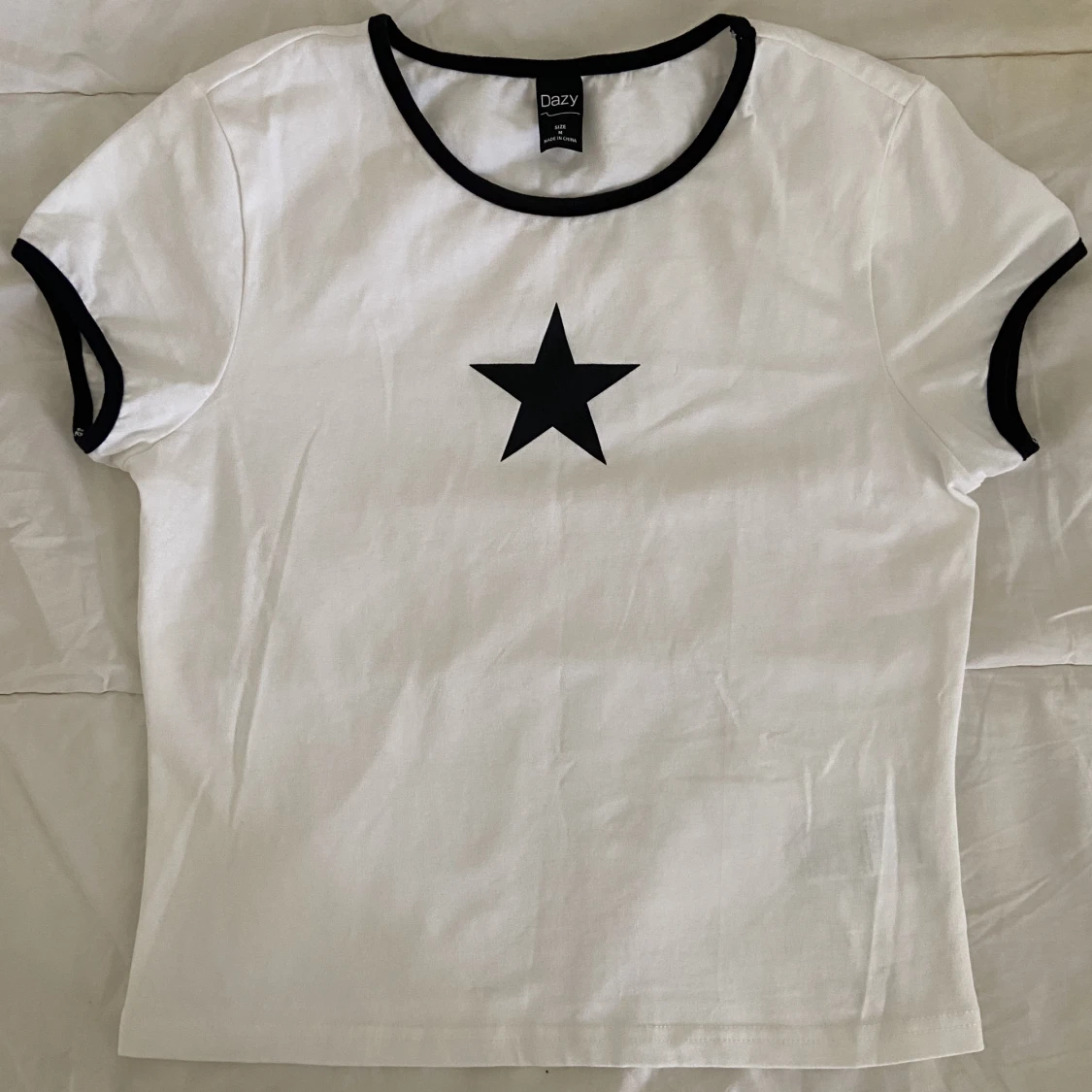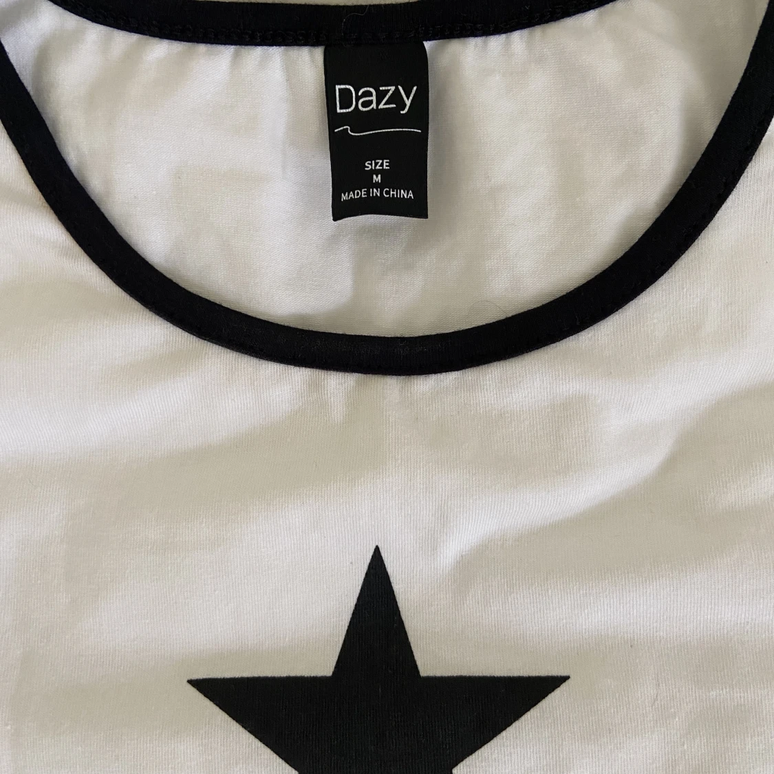 En jätte fin vit tröja men en stjärna i mitten, den passar till allt och är jätte bekväm! Jag använde den aldrig på grund av storleken. Den är i storlek M men den är lite mindre. :)