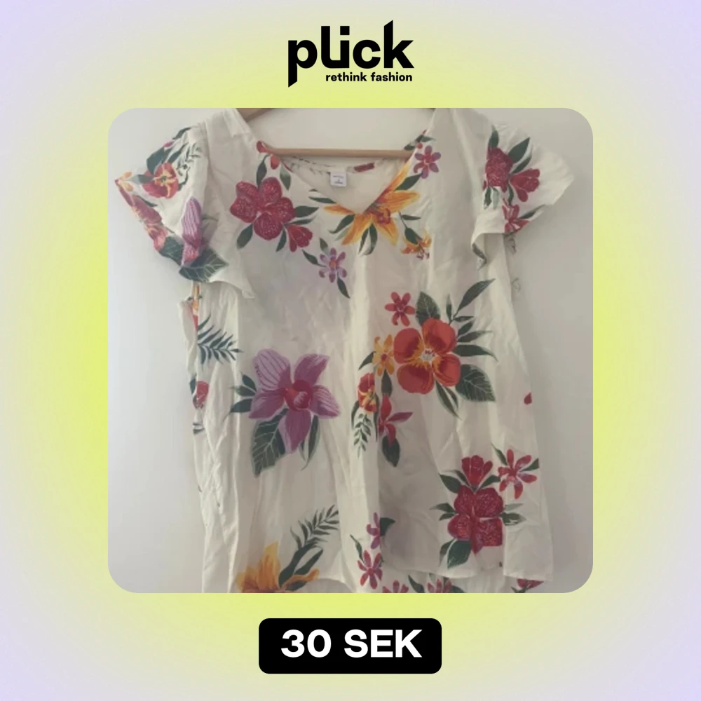 Tröjan är vit med blommor på, precis som på bilderna. Gjord av ett tunnt material. Tillverkad i Vietnam.