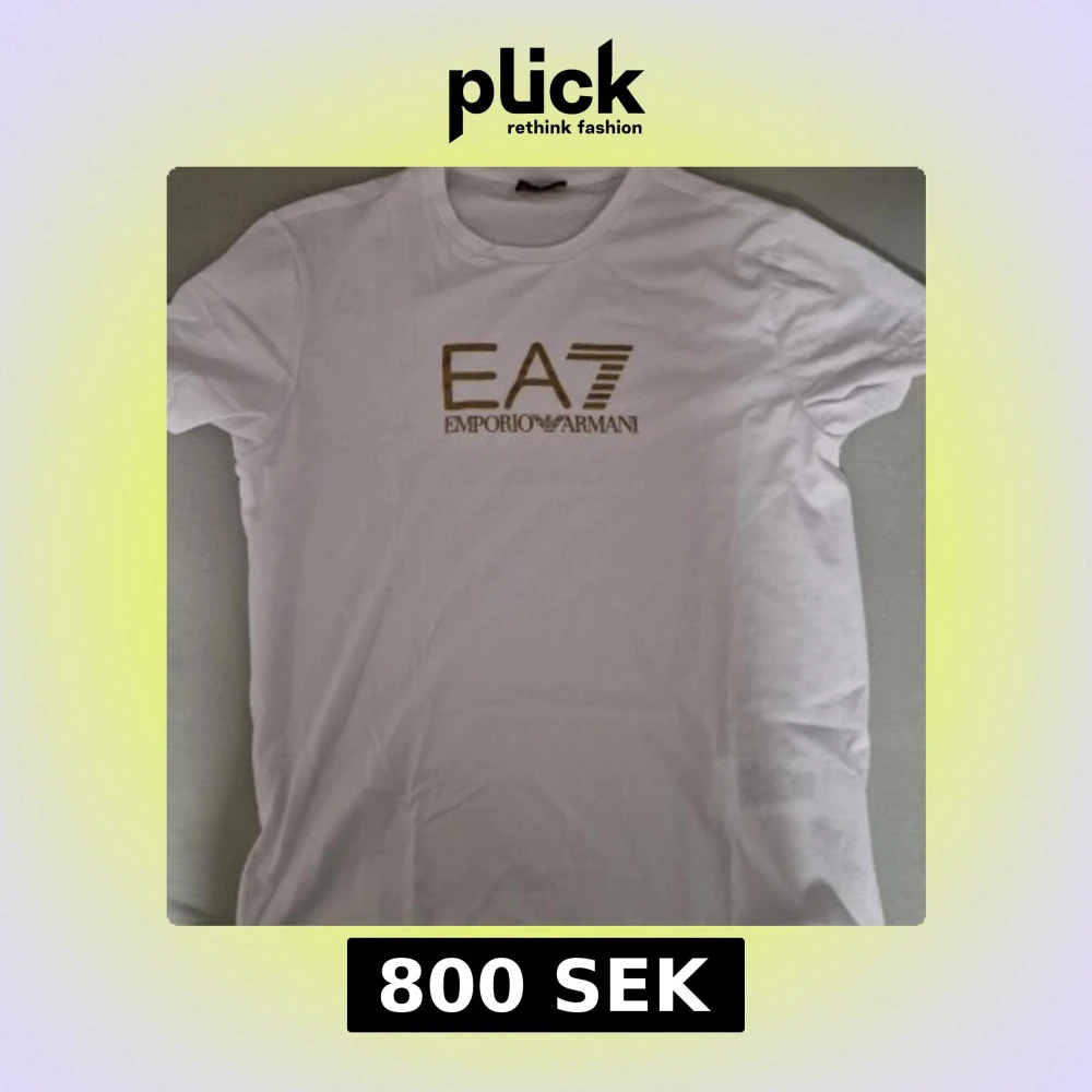 Säljer en vit t-shirt från Emporio Armani EA7 med guldig logga tryckt på bröstet. Klassisk rund halsringning och korta ärmar. Tillverkad i mjuk bomull för en skön känsla. Perfekt för dig som gillar stilrena och exklusiva plagg.