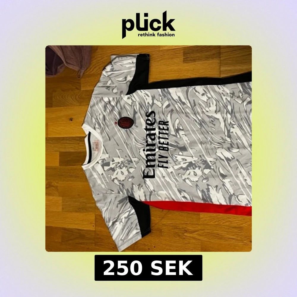 Säljer en AC Milan fotbollströja i vit och grå med abstrakt mönster, svarta och röda detaljer på sidorna. Tröjan har korta ärmar, rund hals och klubbens emblem på bröstet. Materialet är lätt och andas, perfekt för träning eller match.