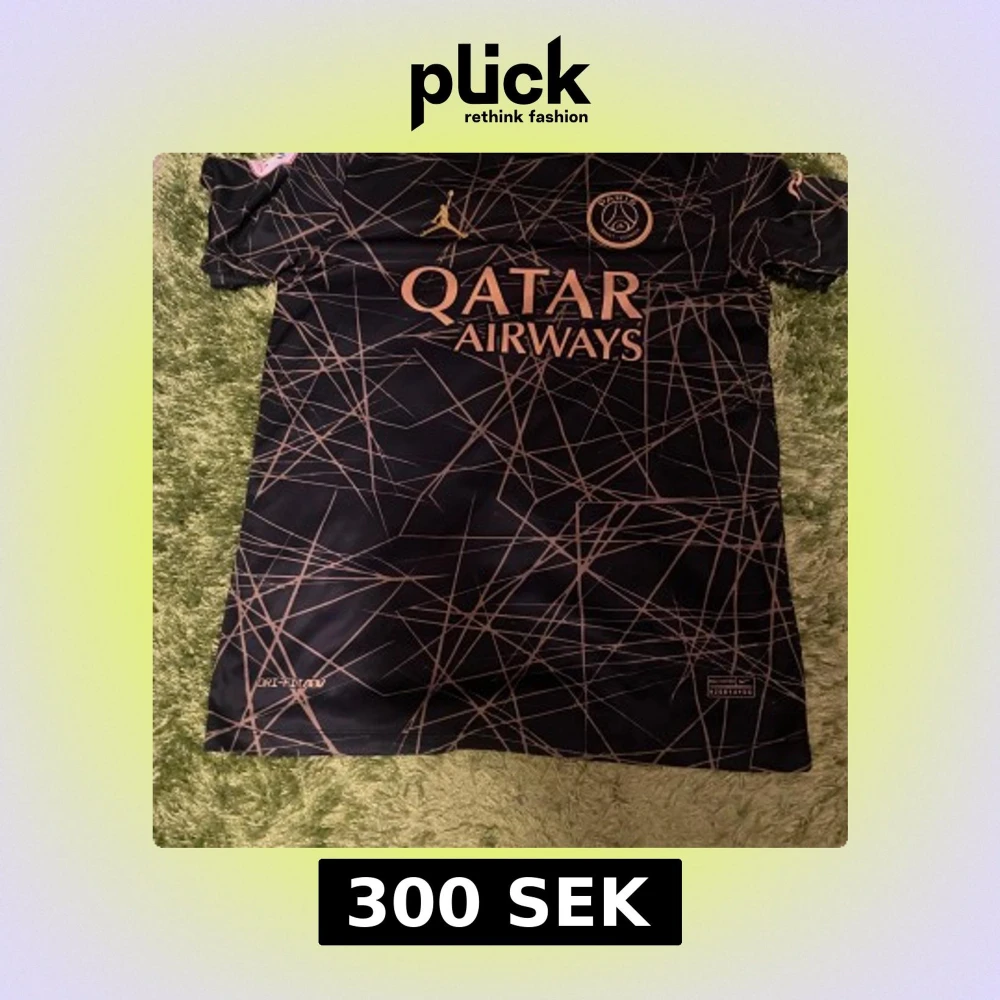 Säljer en svart PSG fotbollströja med guldiga detaljer och tryck, inklusive Mbappé #7 på ryggen. Tröjan har korta ärmar, Qatar Airways sponsorlogga och ett unikt mönster i guld. Perfekt för dig som älskar fotboll och PSG.