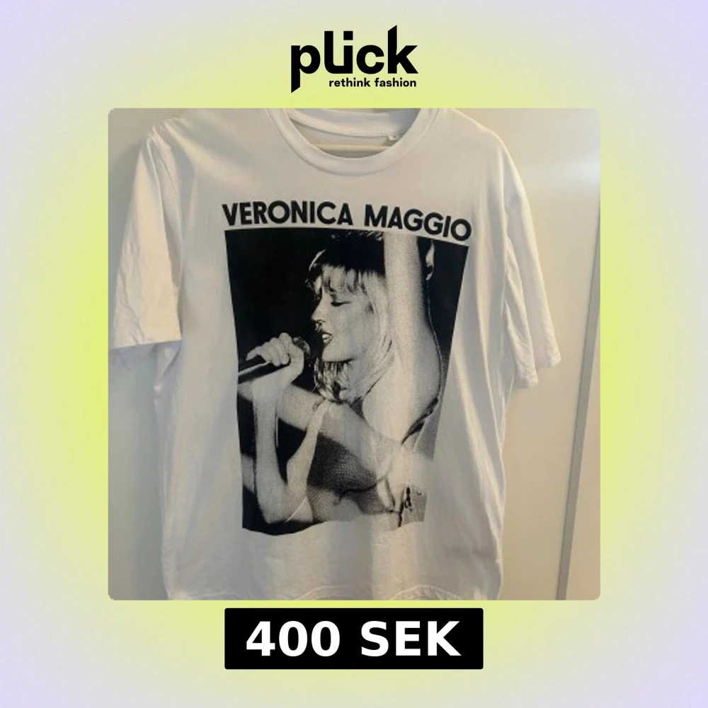Vit t-shirt med stort svartvitt tryck av Veronica Maggio på framsidan. Såldes under hennes konsert i Uppsala på studenternas. Använd och tvättad en gång. Storlek M men sitter snyggt, lite oversized på mig som jag storlek S. Rök och parfymfritt hem, katt finns. Skriv privat om du har fler frågor 💕