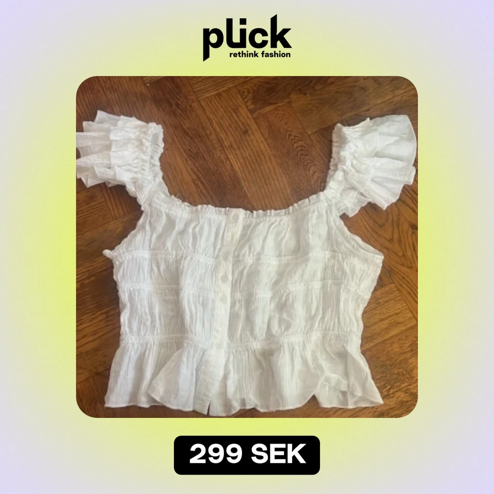 Jättefin sommar topp ,köpt second hand Italien ,finns inte storlek men skulle säga att den passar mer M 😍 annars S lite oversize .Jättesnygg för sommar 🤩