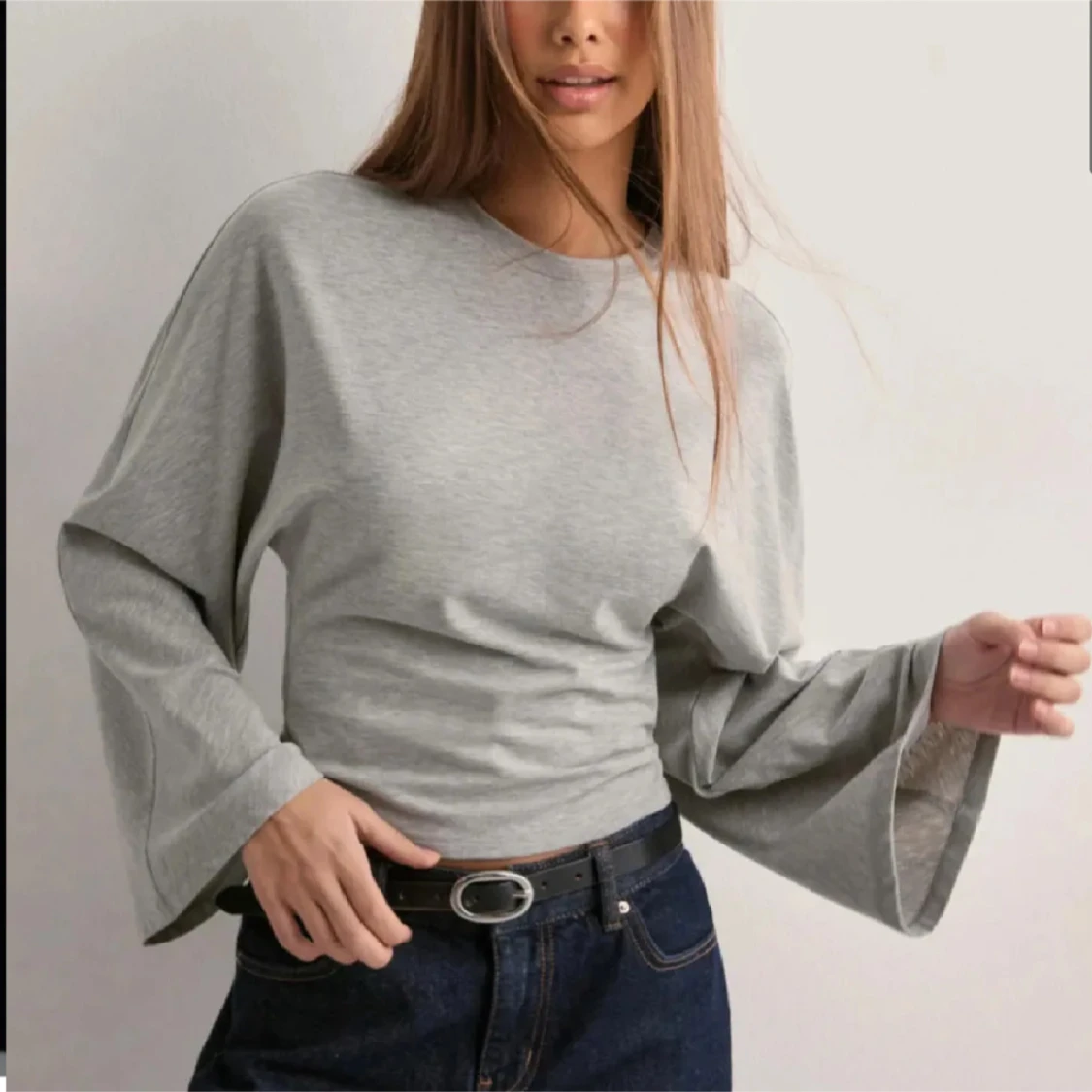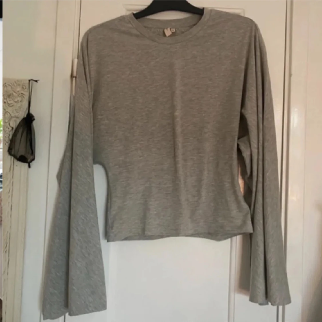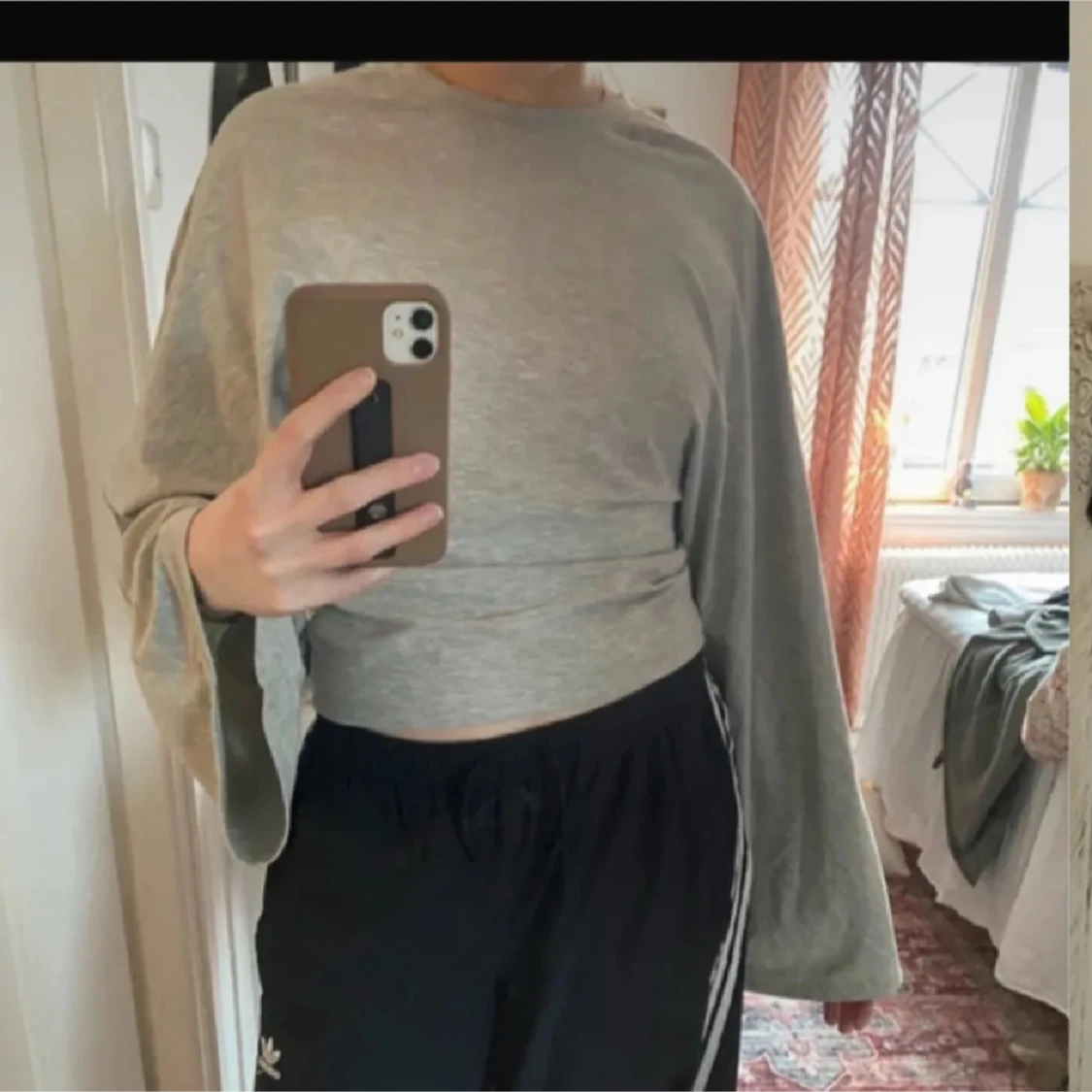 Säljer en stilren grå långärmad topp med vida ärmar. Perfekt för en avslappnad look. Toppen har en rund halsringning och är tillverkad i ett mjukt material. Använd en gång! Kolla gärna in mina andra publiceringar! Nypris: 299kr