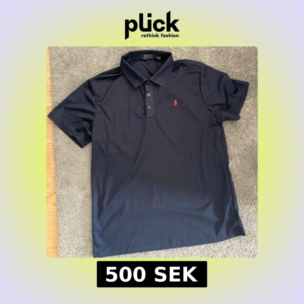 Säljer en stilren mörkblå pikétröja med klassisk krage och tre knappar. Tröjan har en röd broderad logotyp på bröstet. Perfekt för en avslappnad men ändå elegant look. Helt ny (ej äkta)