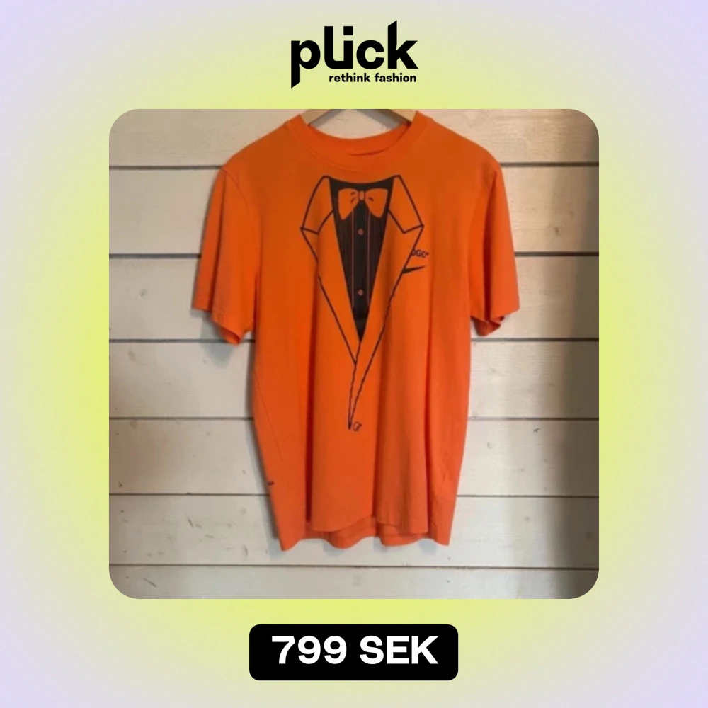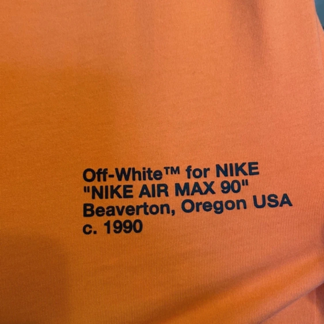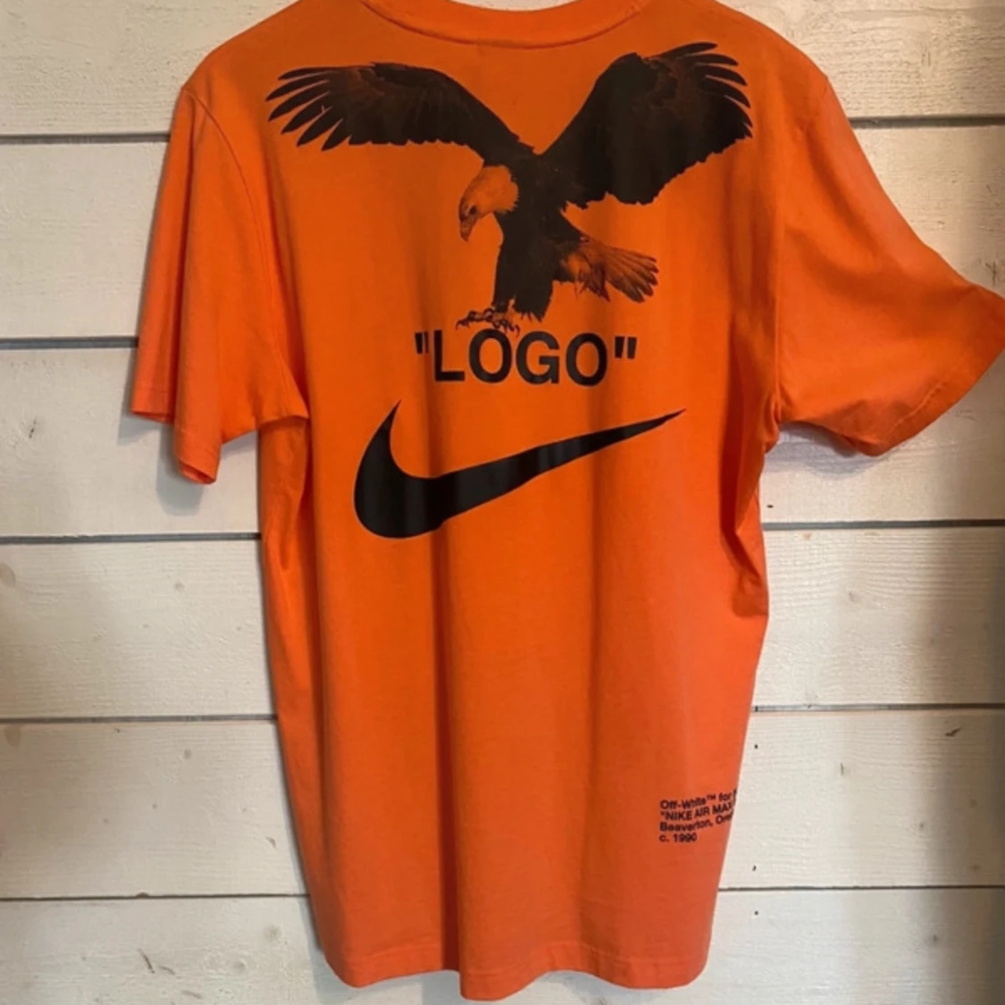 Säljer en cool orange t-shirt från Off-White x Nike. Den har ett tryck av en smoking på framsidan och en stor örn med 'LOGO' och Nike-swoosh på baksidan. Perfekt för dig som vill sticka ut! T-shirten är i bomull och har korta ärmar. Aldrig använd
