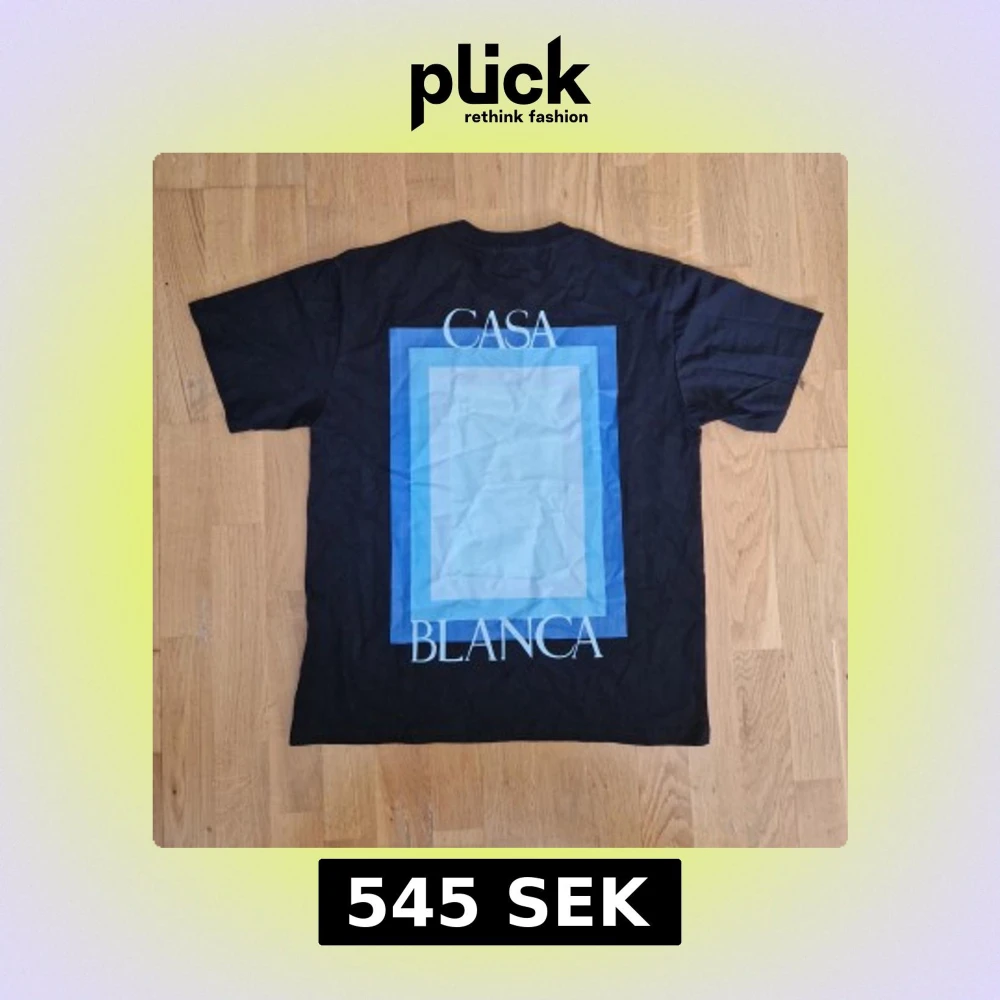 Helt ny svart t-shirt från Casablanca med stort grafiskt tryck i blå toner och texten 'Casa Blanca' på ryggen samt mindre print på bröstet. Klassisk rund hals och korta ärmar. Perfekt för dig som gillar stilrena men ändå unika plagg. Storlek står S men passar M !