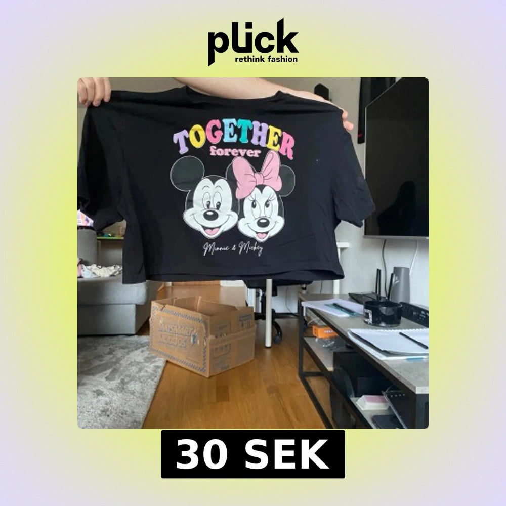 Svart croppad t-shirt med färgglad text 'Together forever' och stort tryck av Minnie och Mickey Mouse på framsidan. Minnie har en rosa rosett. Perfekt för dig som gillar Disney och vill ha en cool och lekfull stil.