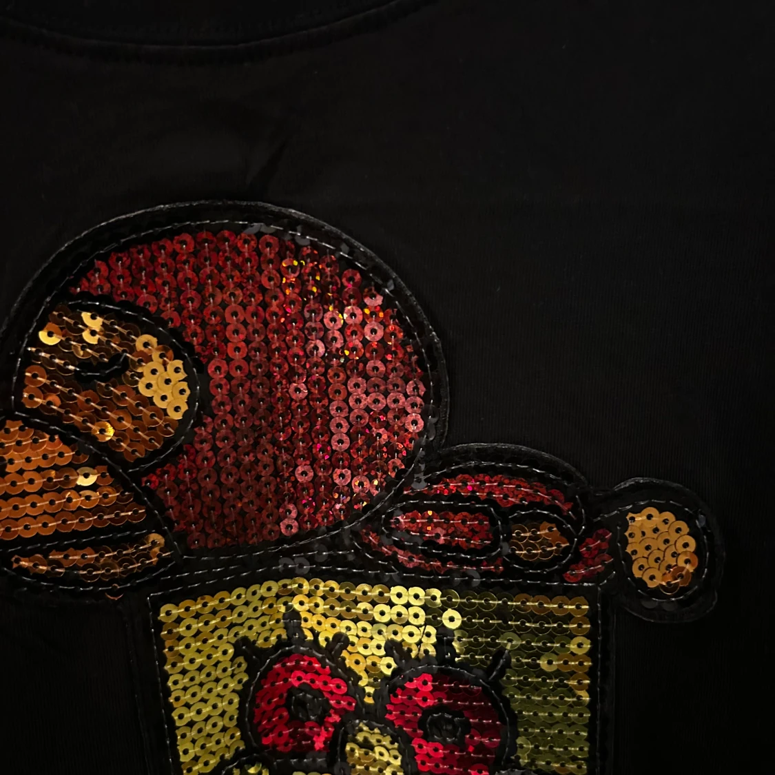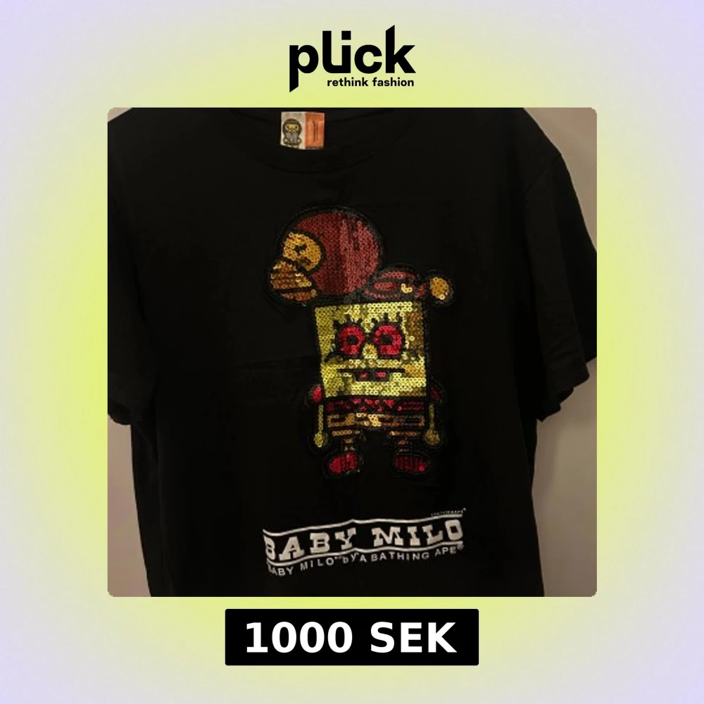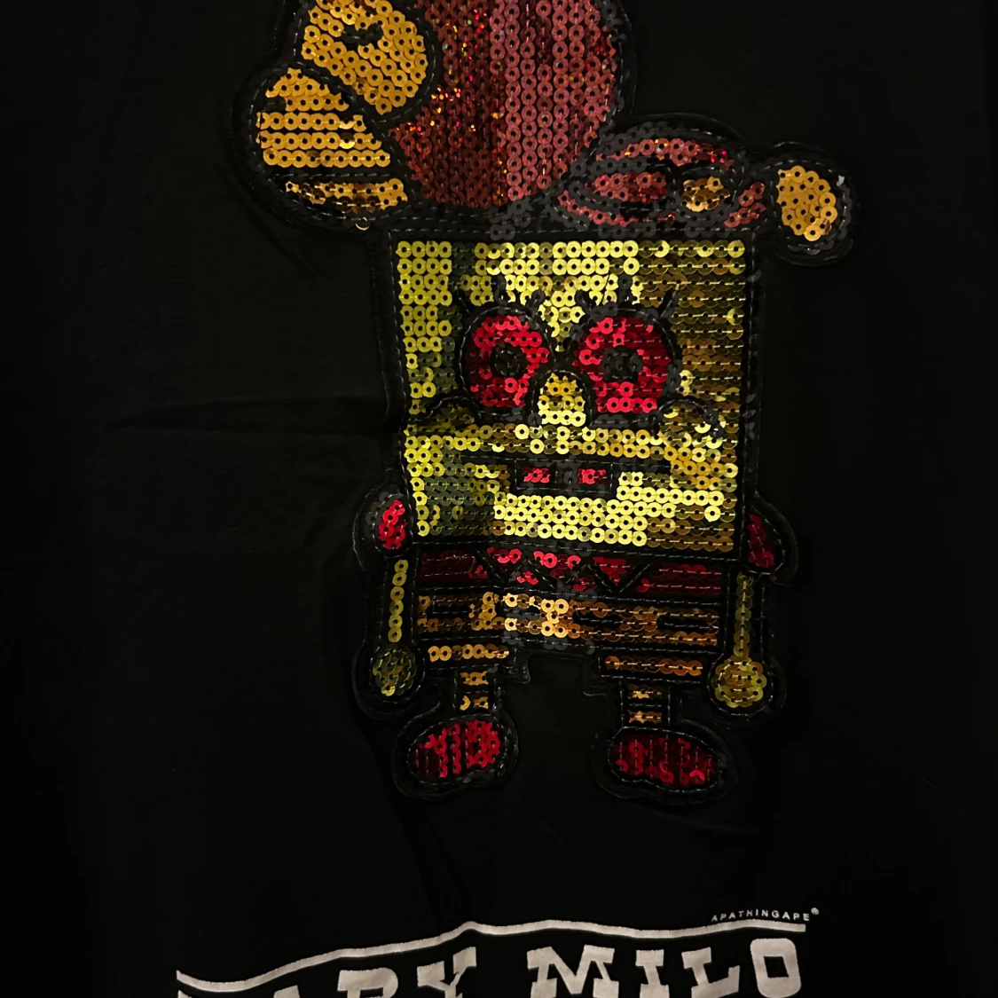Limited edition, Baby Milo x SpongeBob T-shirt (BAPE) Storlek: M Svart t-shirt med unik paljett-design av Baby Milo & SpongeBob. Skimrande detaljer i guld/rött/gult paljetter. Ny skick. ORIGINAL