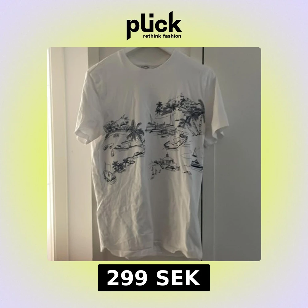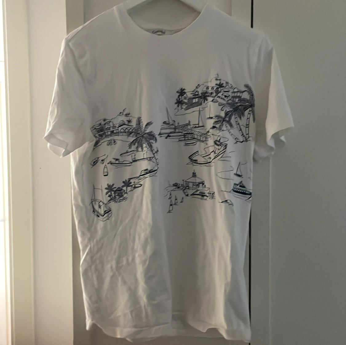 Vit t-shirt med marinblå tecknade motiv av båtar, palmer och kustmiljö. Klassisk rund hals och korta ärmar. Perfekt för en avslappnad och somrig look. Tillverkad i mjuk bomull som känns skön mot huden.