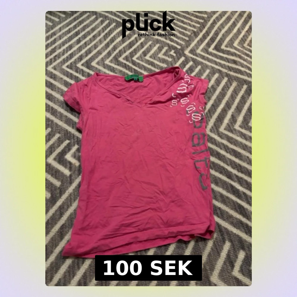 Säljer en rosa t-shirt med v-ringning och coolt tryck i vitt och grönt på ena axeln och sidan. T-shirten är kortärmad och i mjuk bomull. Storleken är M, men den passar mig väldigt bra som S. Tröjan är också lite cropped.