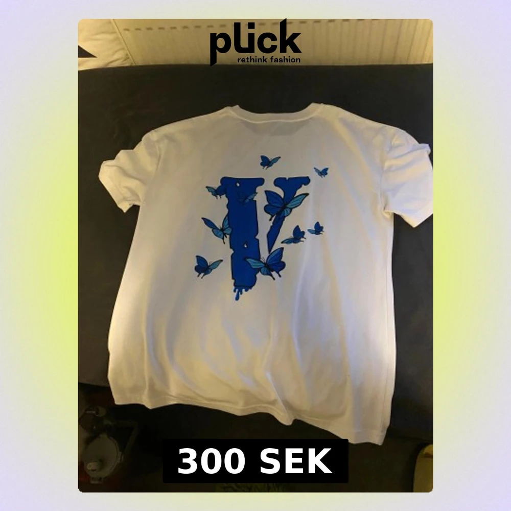 Vit VLONE T-shirt med ett stort blått V-tryck på ryggen, dekorerad med flera blå fjärilar som ger en cool och unik vibe. Klassisk rund hals och korta ärmar. Materialet känns mjukt och lätt, perfekt för dig som gillar stilrena men ändå iögonfallande plagg.