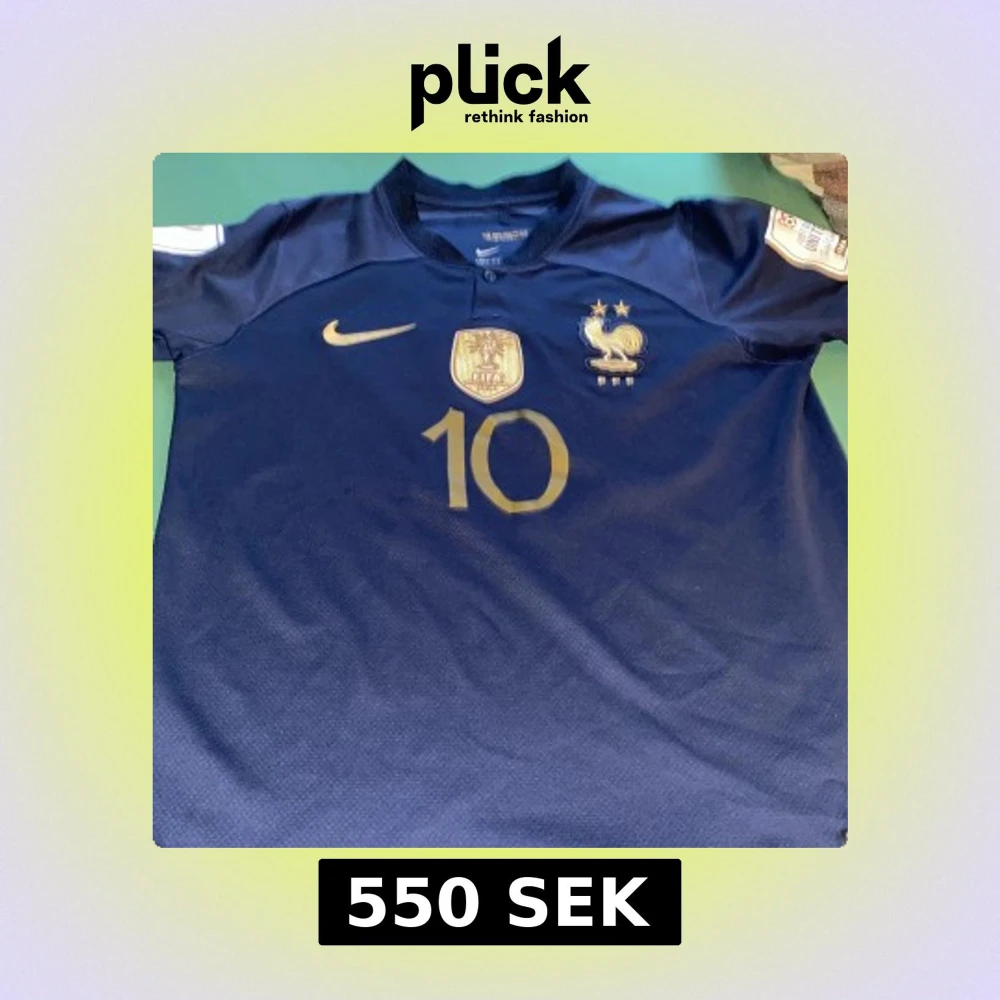 Säljer en blå fotbollströja från Nike med guldiga detaljer. Tröjan har korta ärmar och är prydd med nummer 10 och namnet Mbappe på ryggen. Perfekt för fotbollsfans som vill visa sitt stöd för laget. Mbappe prestera jättebra med denna tröja vem vet kanske du gör samma om du köper den 😉