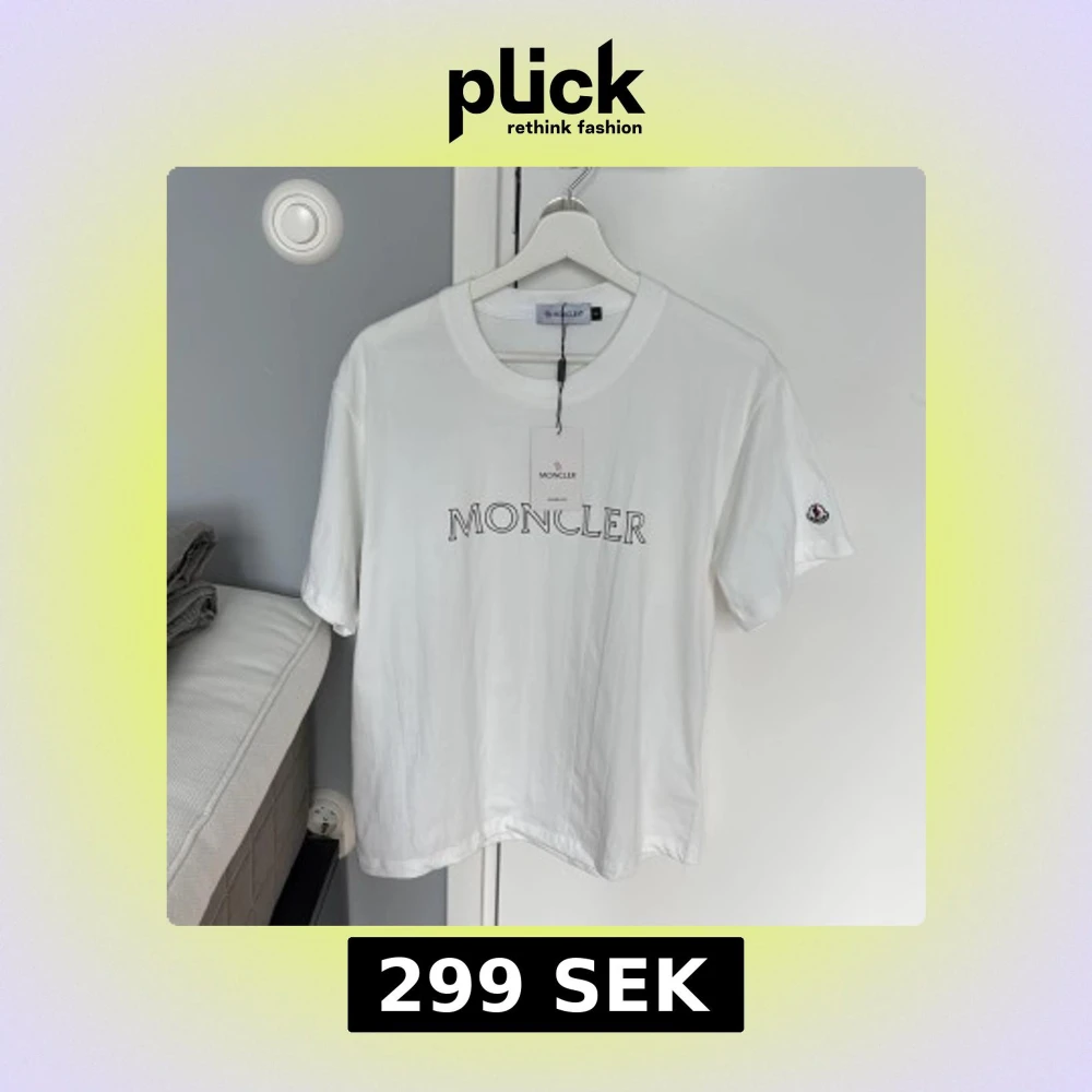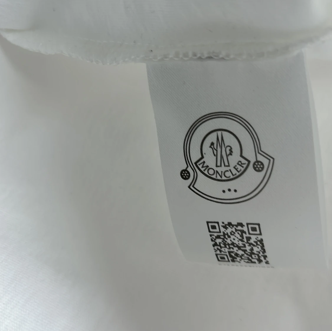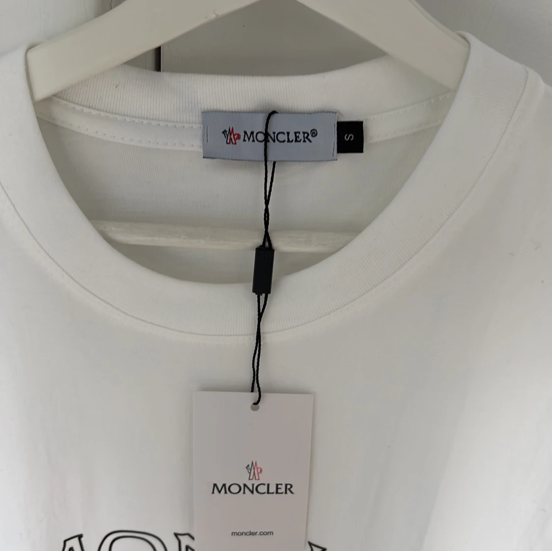 Vit Moncler t-shirt med logga - Vit t-shirt från Moncler med svart logotyp tryckt på bröstet och Moncler-märke på ärmen. Klassisk rund hals och korta ärmar. Tillverkad i mjuk bomull för skön passform. Perfekt för dig som gillar stilrena designer och exklusiva märken. T-shirten är i storlek M men är liten i storlek vilket gör att den sitter som S. Priset är absolut inte spikat. Bara att höra av sig om det finns något intresse!