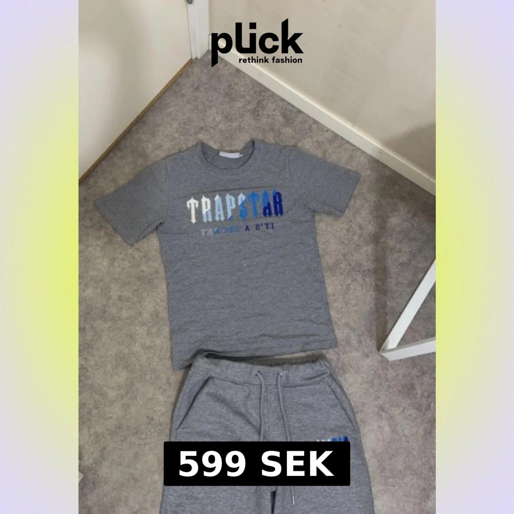 Säljer en grå t-shirt från Trapstar med stort tryck i olika blå nyanser och vitt på bröstet. T-shirten har rund hals och korta ärmar, tillverkad i mjuk bomull som är skön mot huden. Perfekt för dig som gillar streetwear och vill sticka ut med snyggt tryck.