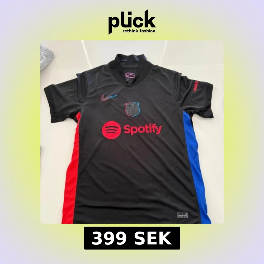 Säljer en svart FC Barcelona fotbollströja från Nike med röda och blå detaljer. Tröjan har korta ärmar och Dri-FIT material för optimal komfort. Den har logotyper för Spotify och UNHCR ACNUR tryckta på framsidan och baksidan.