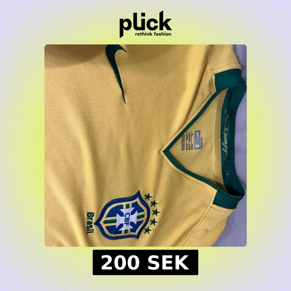 Säljer en gul Brasilien fotbollströja från Nike med gröna detaljer och korta ärmar. Tröjan har Brasiliens emblem på bröstet och en Nike-logga. Perfekt för fotbollsfans som vill visa sitt stöd för laget!